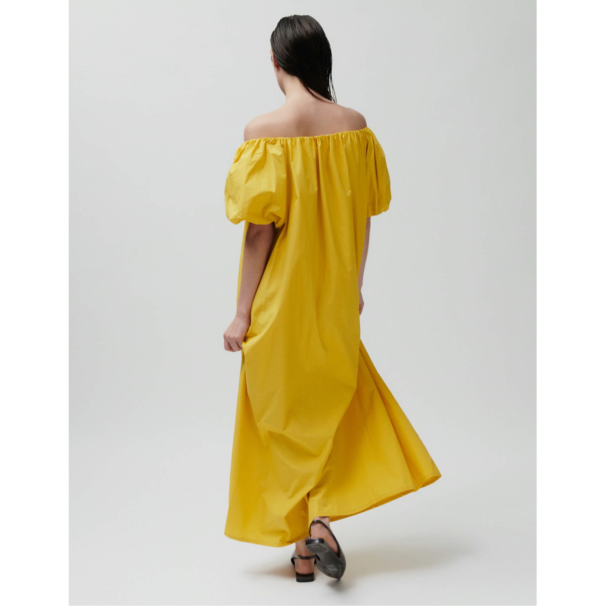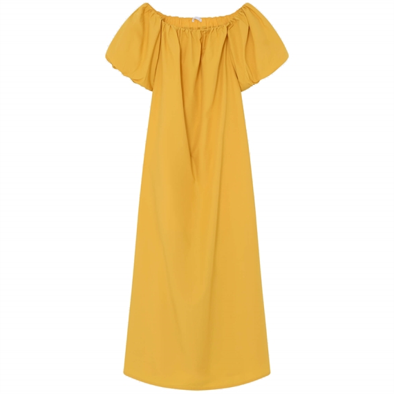 En enkel og elegant kjole fra 2NDDAY i poplin. Kjolen har en løs pasform med elastisk udskæring, der bæres off-shoulder. De korte, voluminøse ærmer giver et feminint udtryk, mens den lette kvalitet gør kjolen behagelig at have på. Perfekt til både hverdag og sommerlige anledninger.