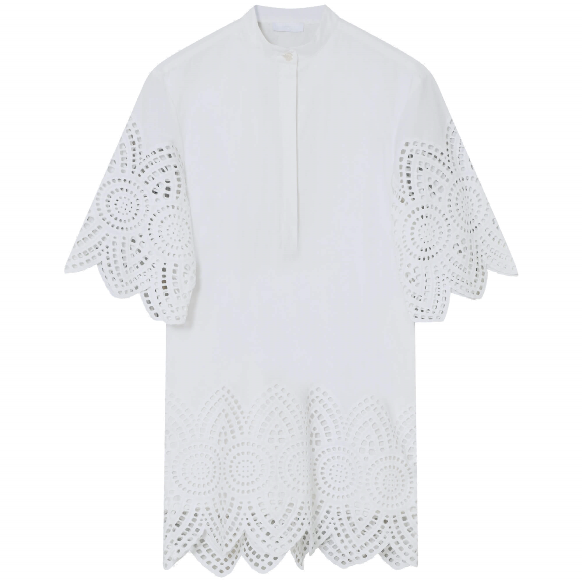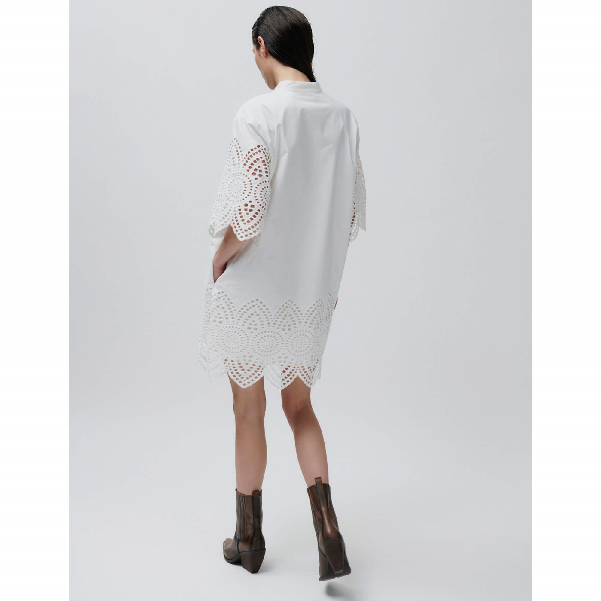 Smuk og enkel kjole fra 2NDDAY i hvid poplin. Kjolen har en løs pasform og fine broderie anglaise-detaljer på ærmer og nederste kant, som giver et feminint udtryk.