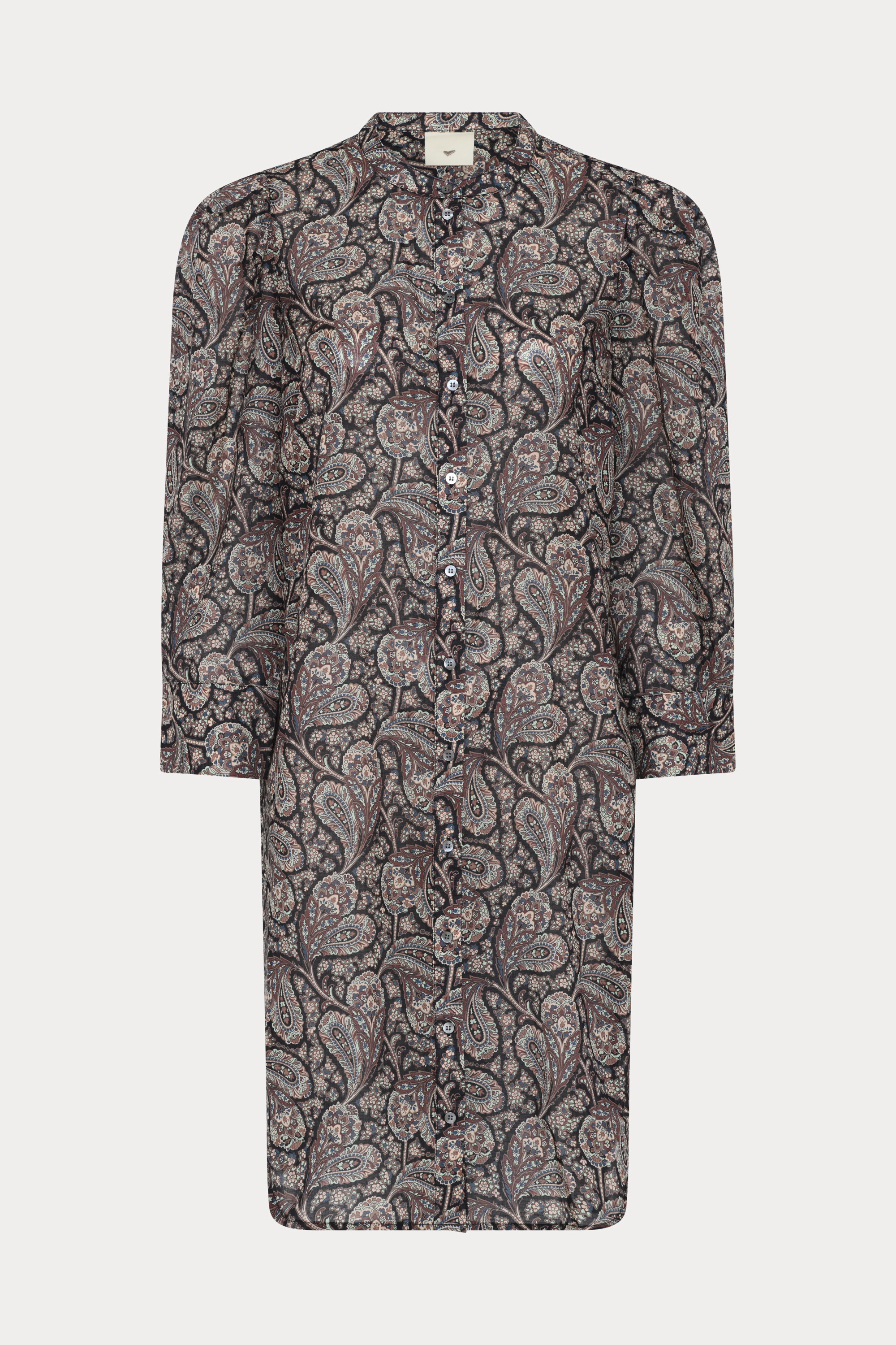 427HMMeva skjortekjole er en let og flydende silhuet i sæsonens paisleyprint. Designet har en klassisk knaplukning, afrundet kant og trekvartlange ærmer, som giver et afslappet men raffineret udtryk.