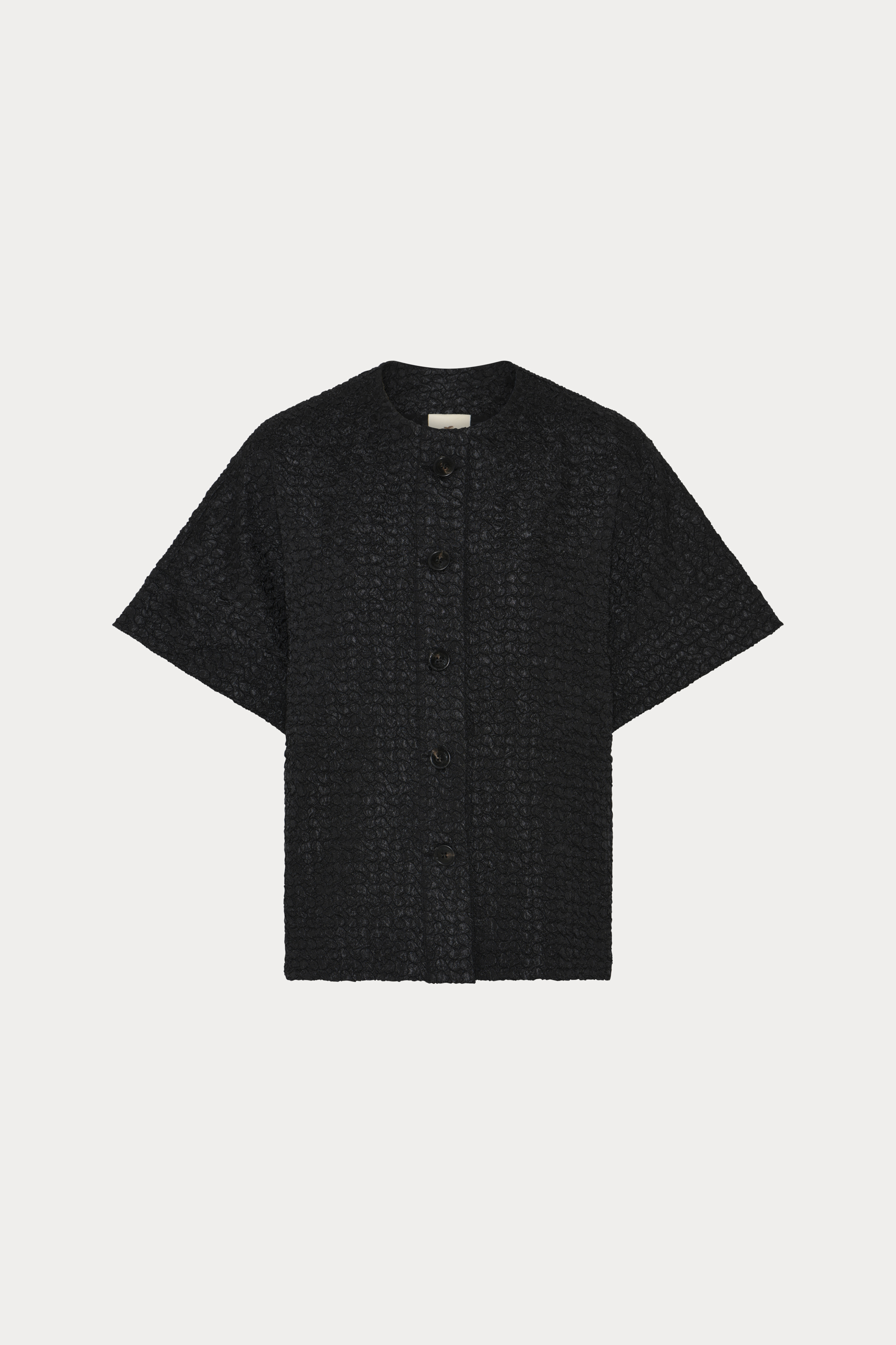 508HMBinta kappe er en kort kappe i struktureret stof med rund halsudskæring, korte ærmer og frontlukning med knapper. En let silhuet med et skulpturelt præg.