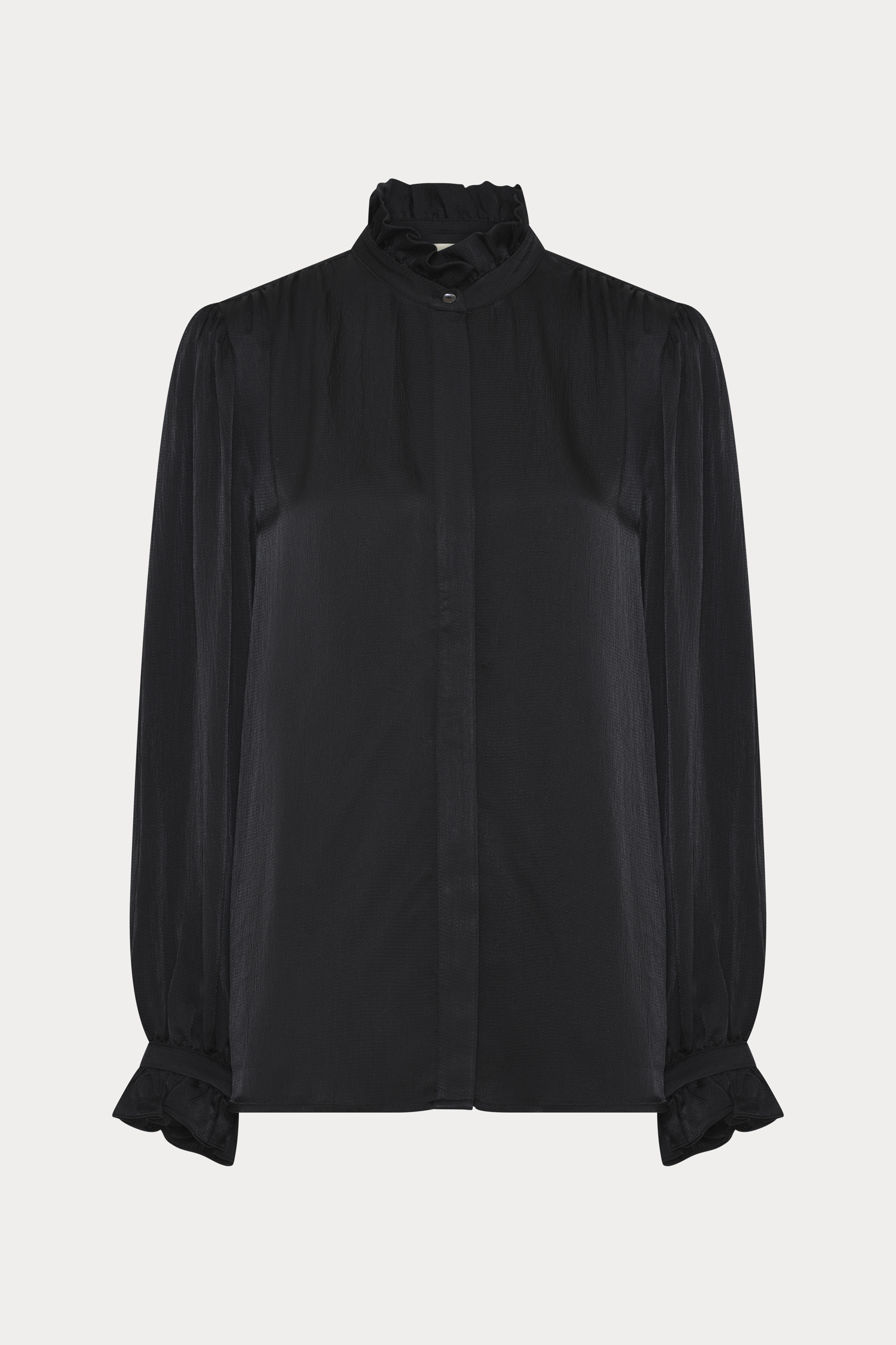603HMMeras er en elegant skjorte i let skinnende stof med høj, blød krave og skjulte knapper, der understreger et sofistikeret udtryk.
