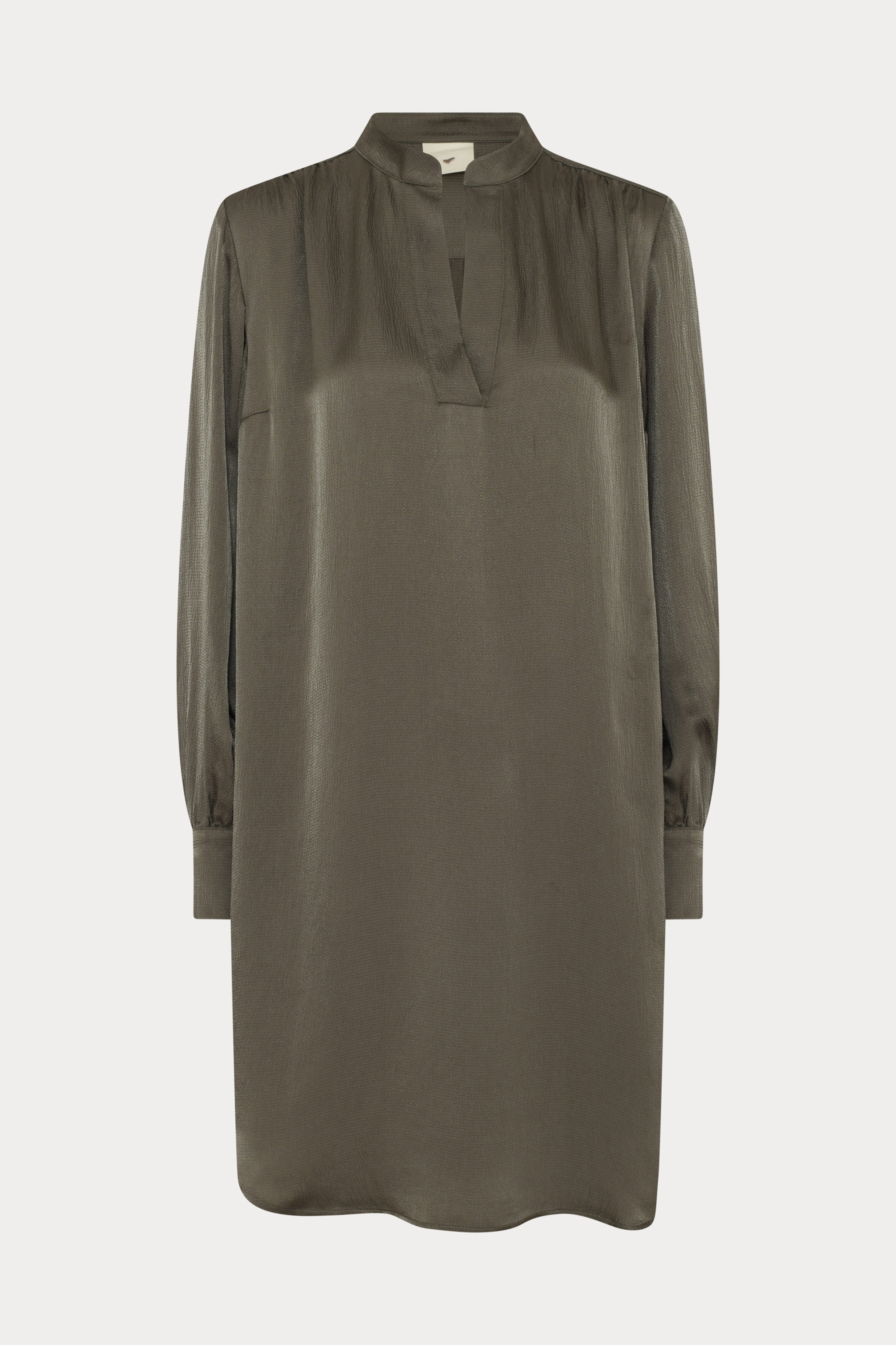 HMMerina er en knælang kjole med V-udskæring, let rynkede skuldre og en afrundet kant. Silhuetten er afslappet og flydende med et diskret, skinnende fald.