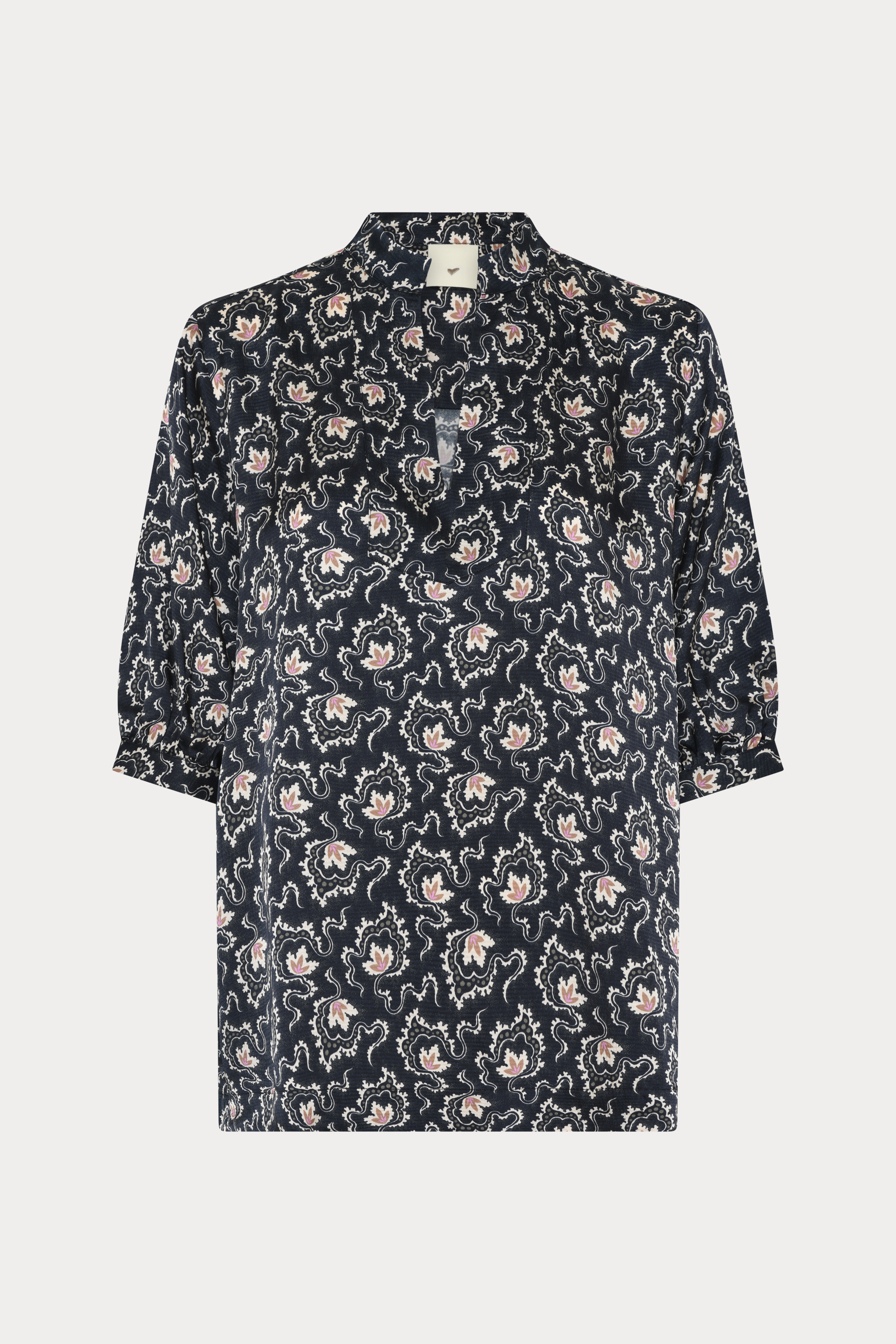 603HMTurin top er en let bluse med løs silhuet og halvhøj krave. Printet med et raffineret paisleymotiv, der tilfører dybde og feminin lethed.