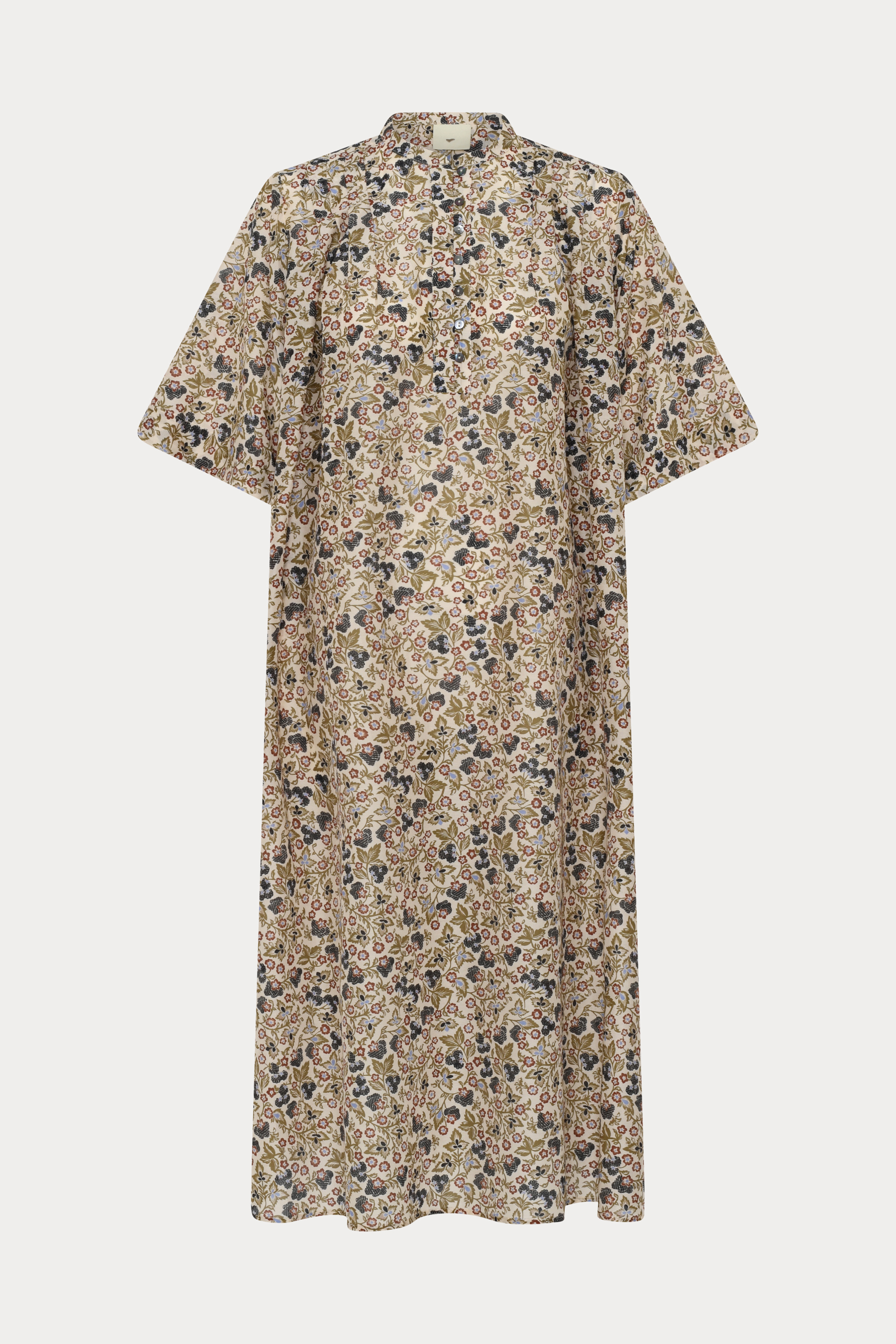 HMVesan kjole er en lang, voluminøs kjole med små læg over skuldrene og et luftigt fald. Det florale mønster tilfører kjolen et poetisk udtryk med naturens egen ro.
