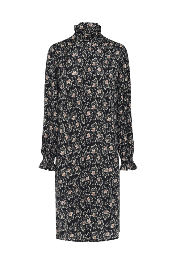 652HMHelai kjole er en knælang kjole med høj flæsekrave og lange ærmer afsluttet med elastiske manchetter. Printet i sæsonens paisleymotiv for et elegant, men ubesværet udtryk.