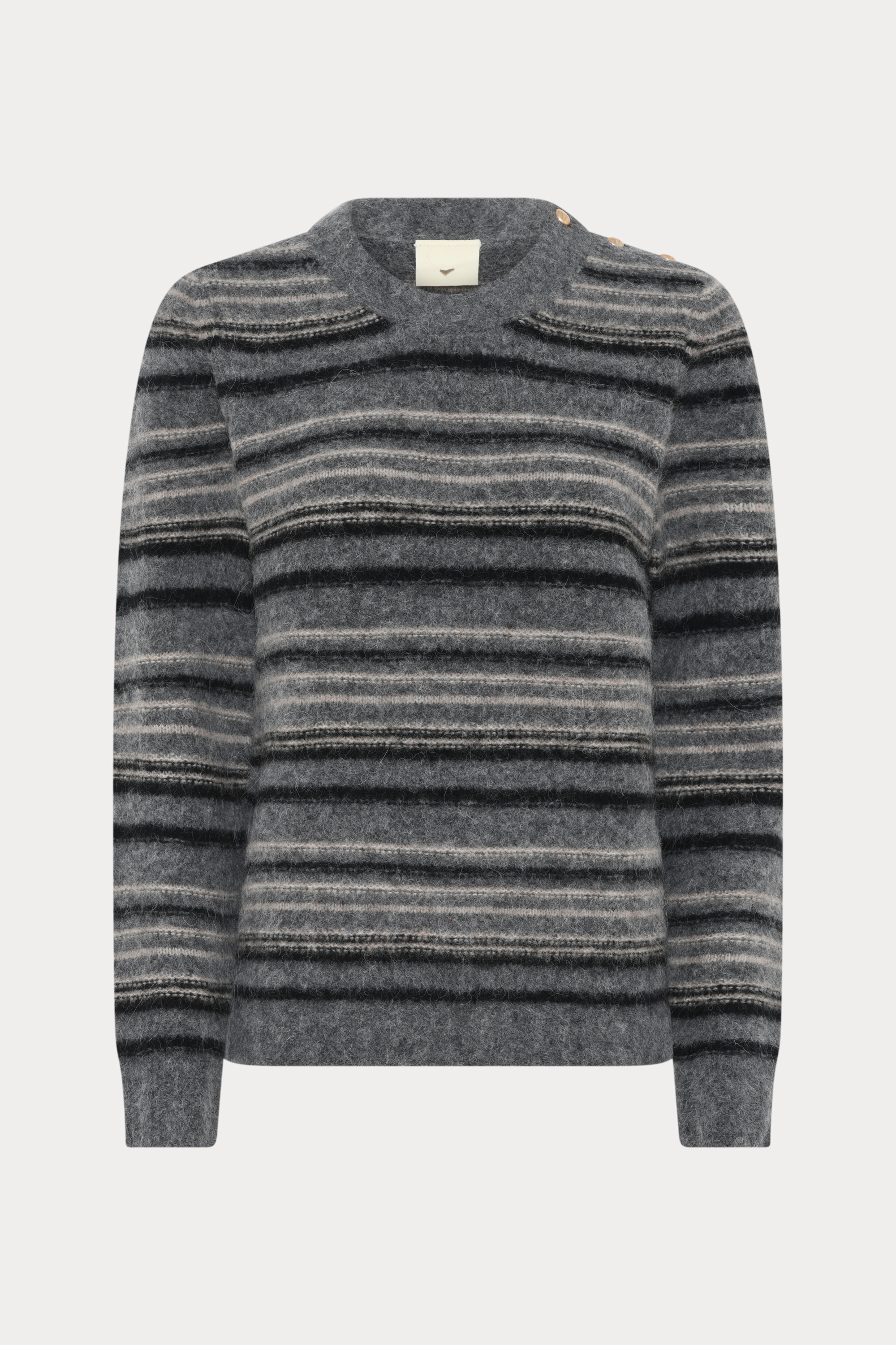 HMKinea strik er en klassisk sweater med rund hals, diskrete knapper på skulderen og horisontalt ribstrikket hals. En rolig silhuet med subtil struktur i striberne.