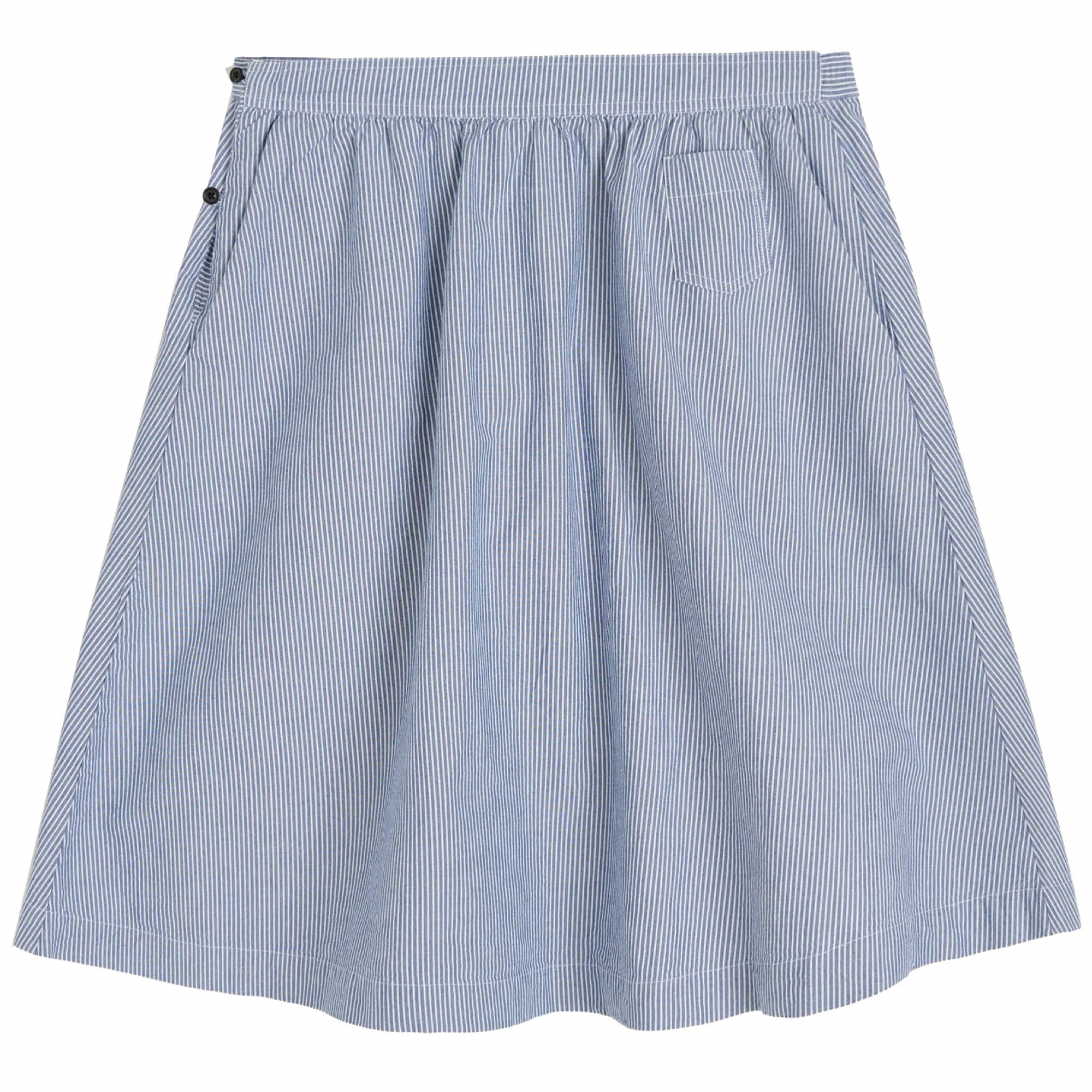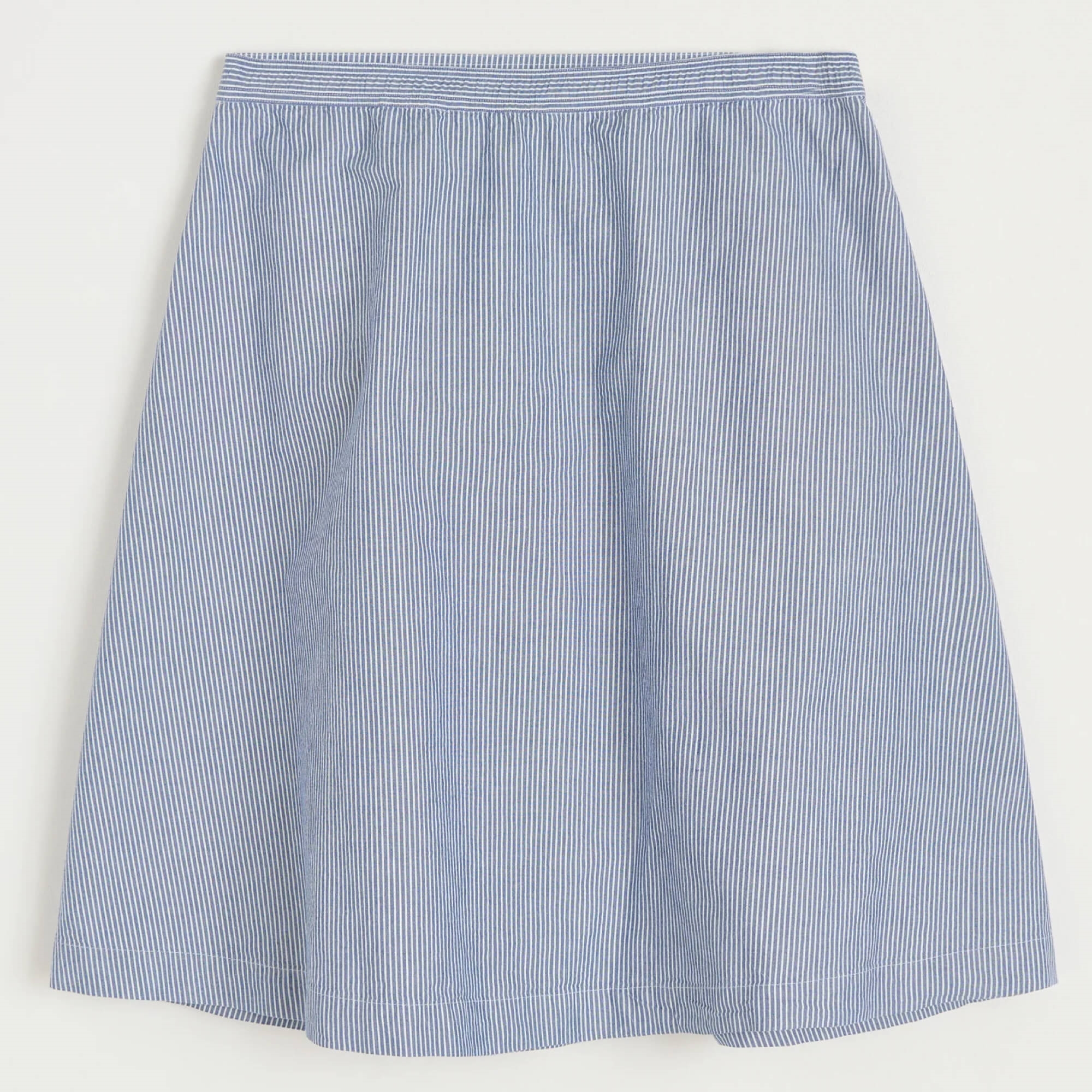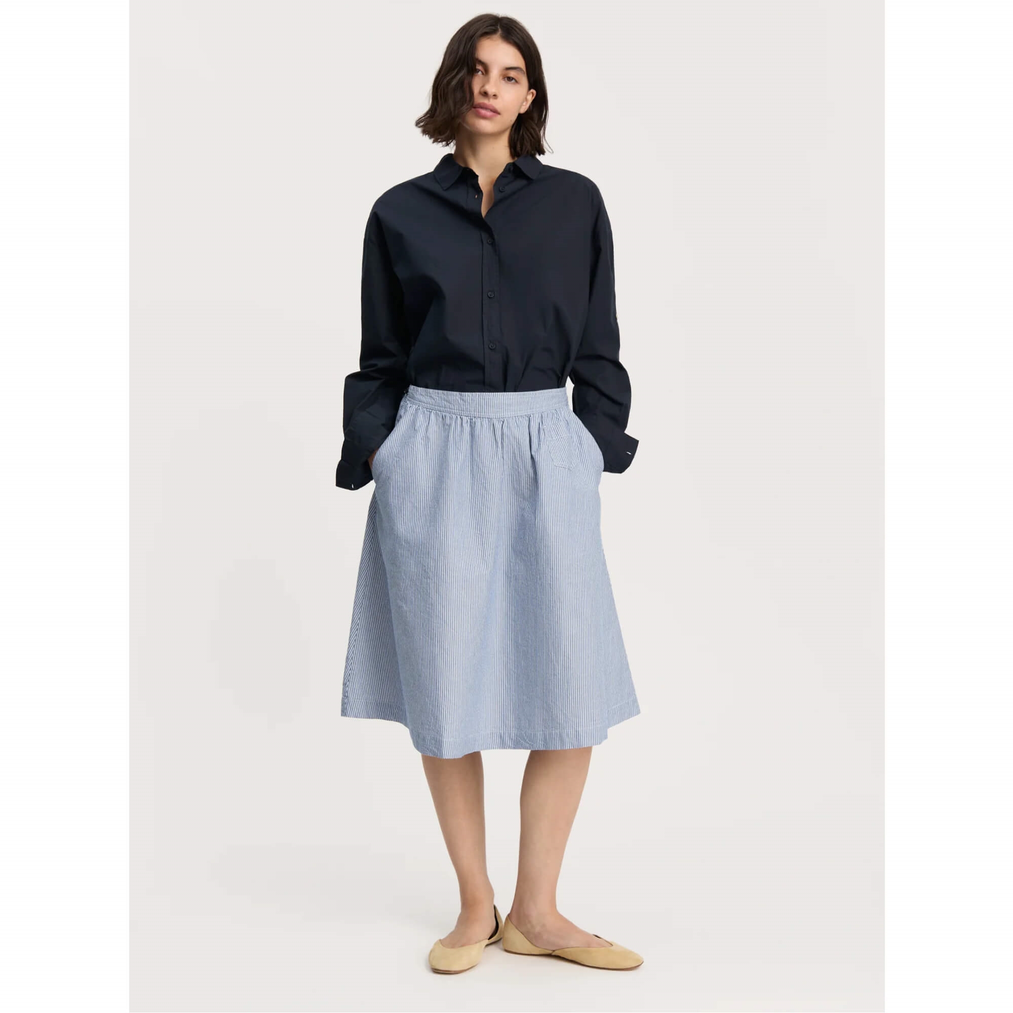 En tidløs, mellemlang nederdel fra Aiayu som er fremstillet af fin, økologisk bomuld. Designet i en let A-formet silhuet med elastisk talje bagtil, en dekorativ lomme, knaplukning i siden, voluminøse skrålommer og et delikat blåstribet mønster, der giver et feminint udtryk.