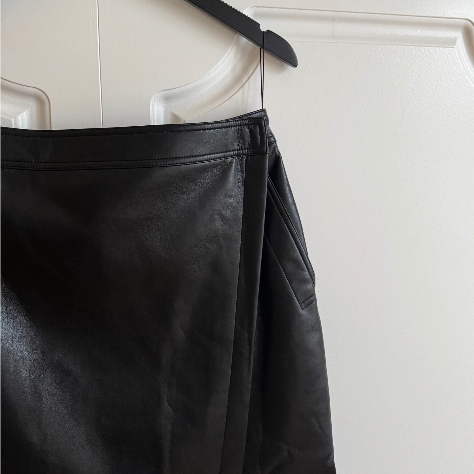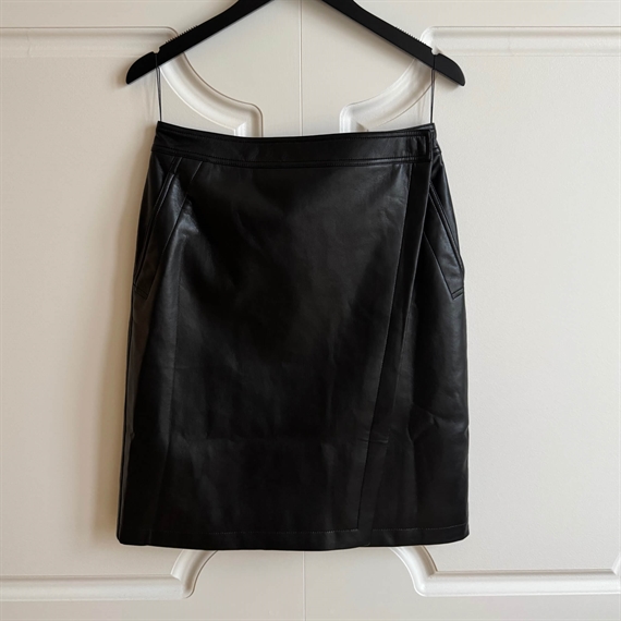 Alanis Nederdel fra Anine Bing er en elegant og tidløs mininederdel med et moderne slå-om-snit, der giver et flatterende fald og et sofistikeret udtryk. Nederdelen er fremstillet i blødt sort læder med en glat overflade og rene linjer. Diskrete sidelommer tilføjer funktionalitet uden at gå på kompromis med det minimalistiske design.
