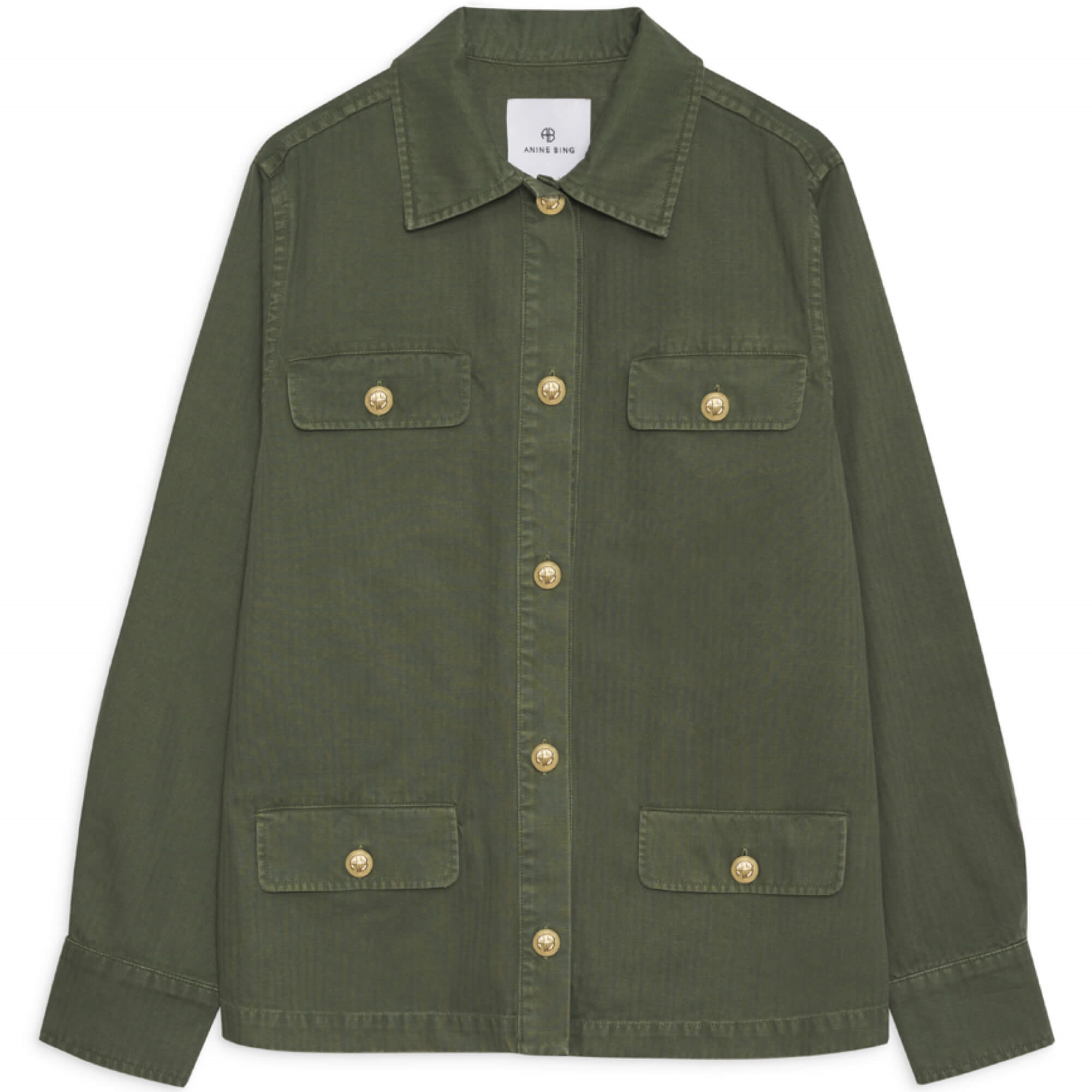 Corey Jakke fra Anine Bing er en jakke i bomuld i en armygrøn farve. Jakken har lange ærmer, knaplukning foran og fire klaplommer. Den er detaljeret med guldfarvede knapper med Anine Bing-logo.