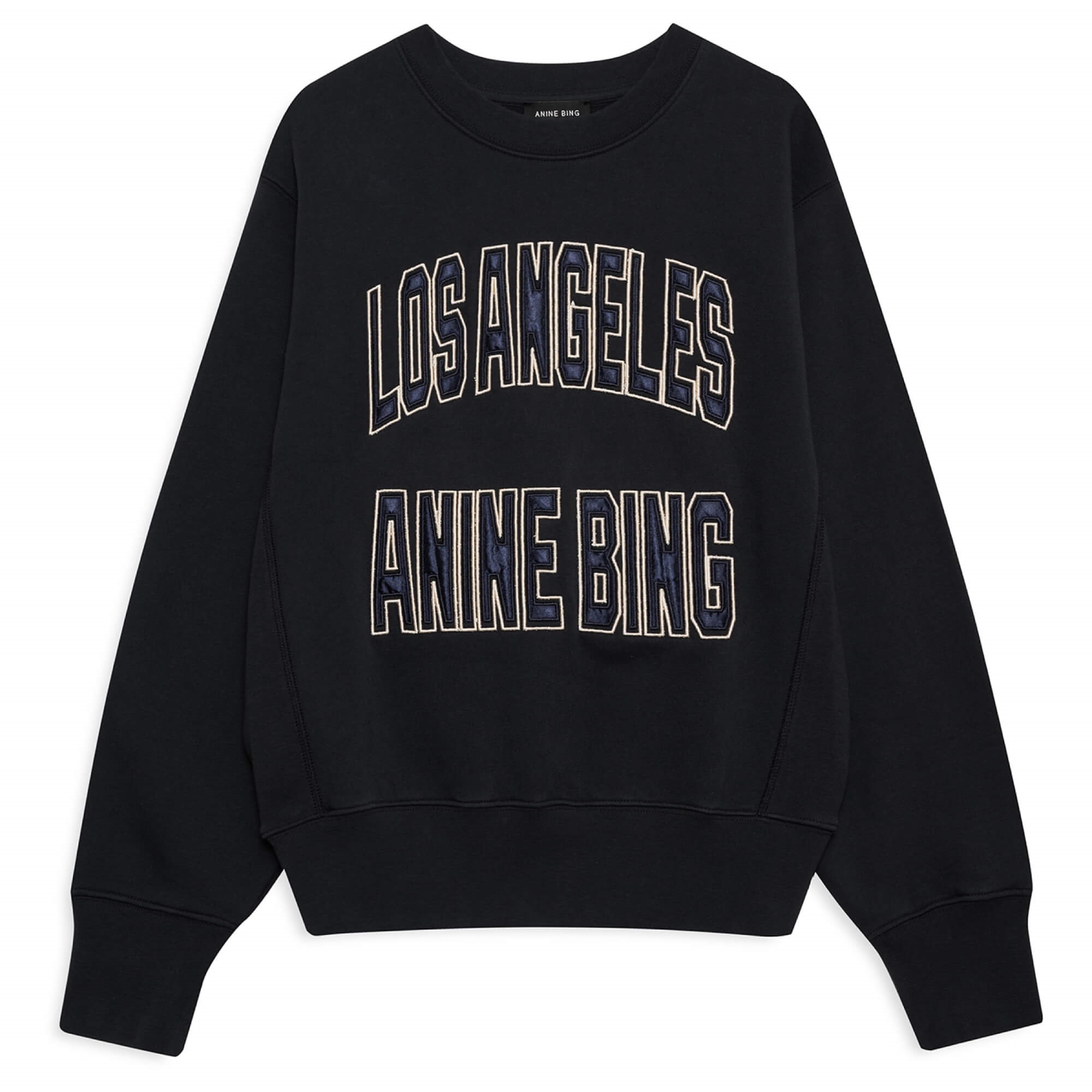 Denne sweatshirt fra Anine Bing er sort og har et afslappet, klassisk design med tydelig inspiration fra amerikansk college-stil. Foran står der “Los Angeles” øverst og “Anine Bing” nedenunder i store, broderede bogstaver. Bogstaverne er beige med mørkeblå skyggeeffekt, hvilket giver et vintage og sporty udtryk. Sweatshirten har rund hals, lange ærmer og ribkanter ved håndled og forneden. Pasformen er let boxy og en smule kortere, hvilket giver et moderne og afslappet look, perfekt til hverdagsbrug.