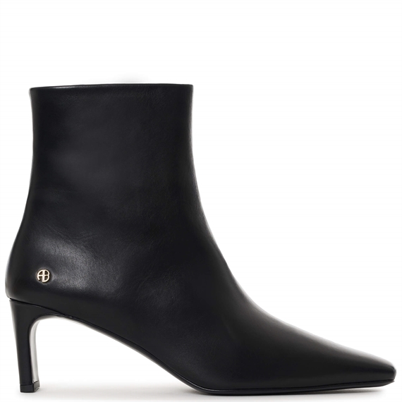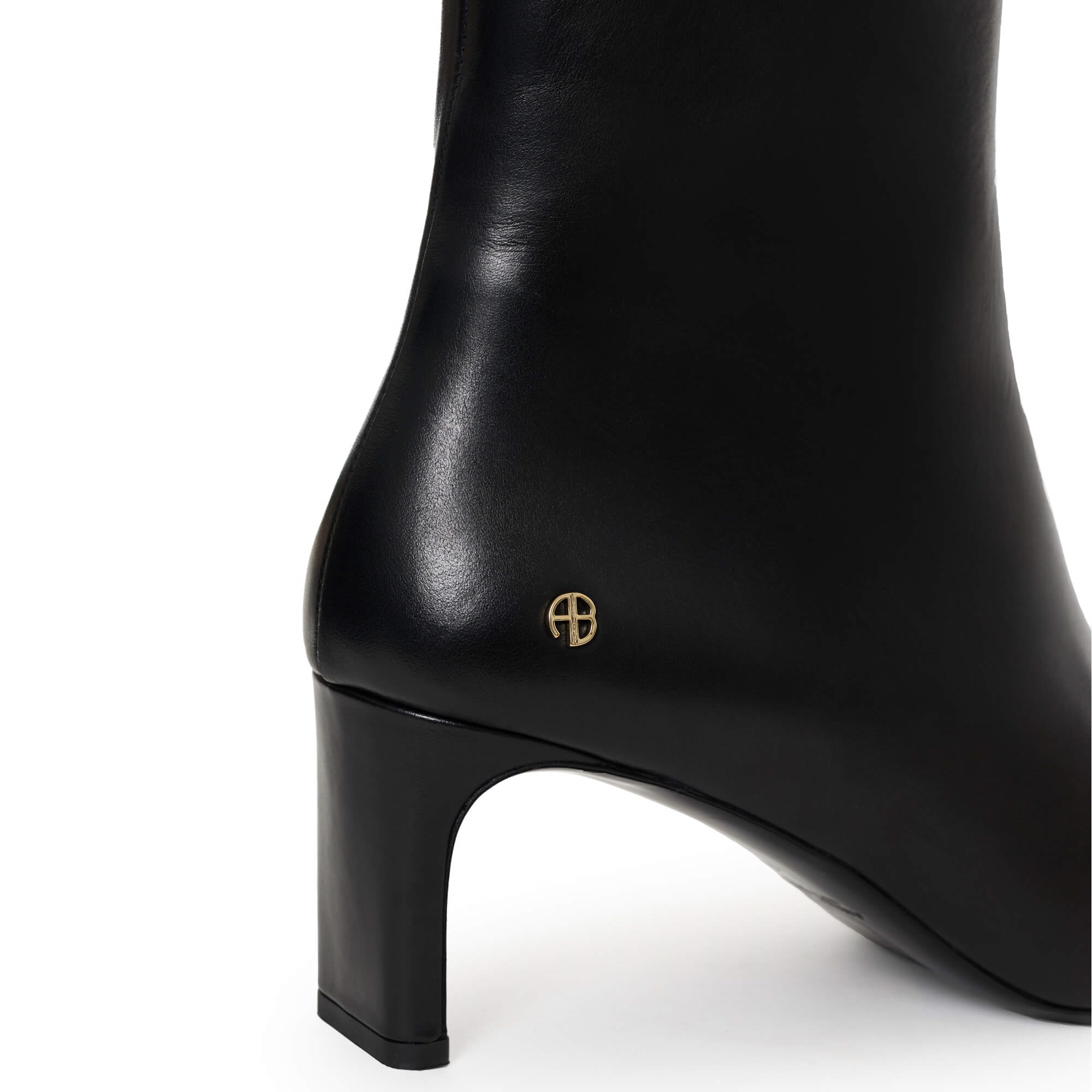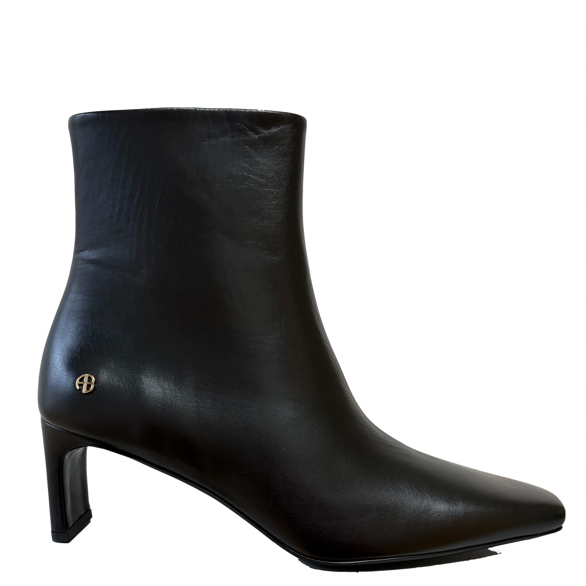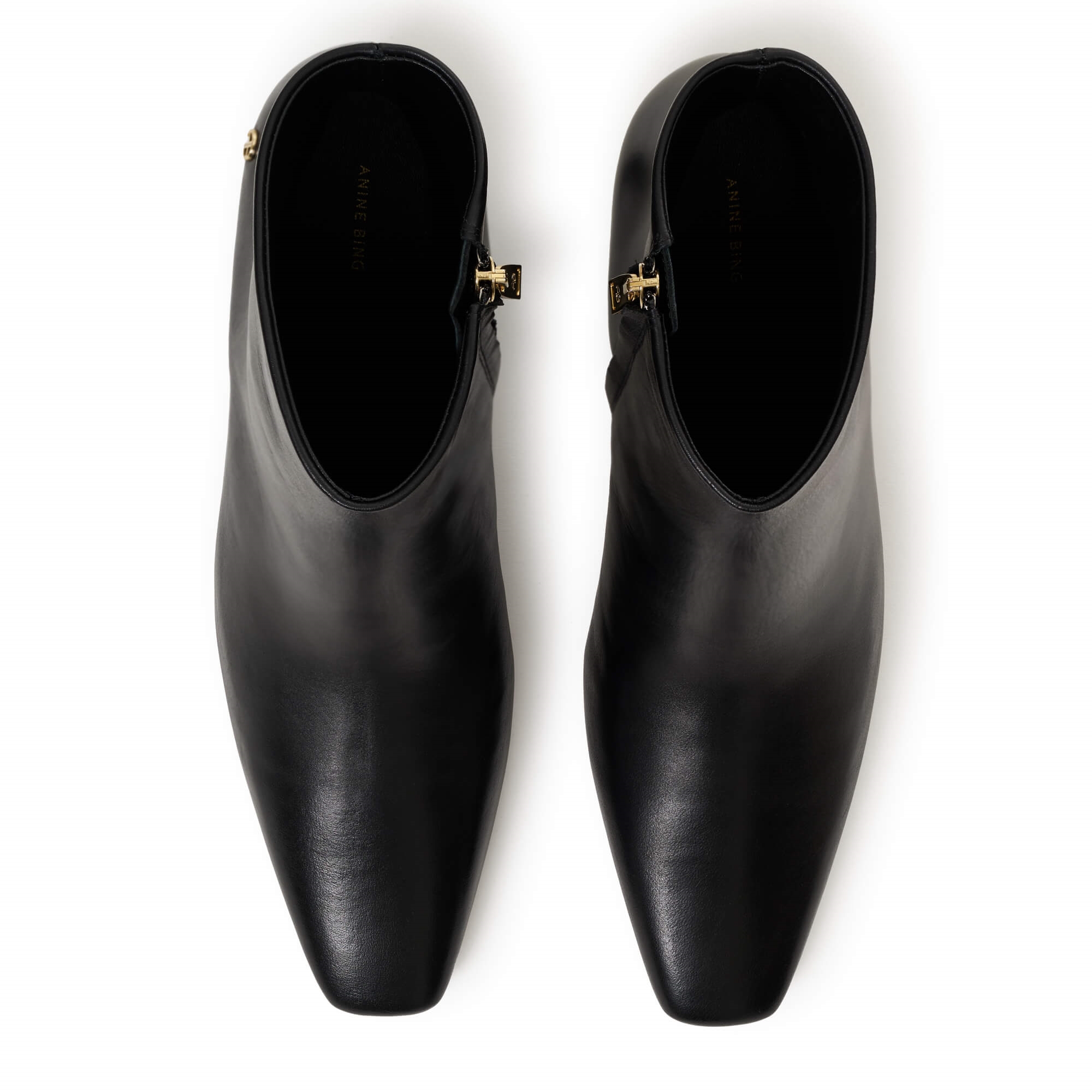 En elegant og tidløs støvlet i glat sort læder fra Anine Bing. Modellen har en slank silhuet med spids snude og en mellemhøj hæl, der giver et sofistikeret og feminint udtryk. Skaftet er ankelhøjt og sidder tæt omkring benet, hvilket skaber et skarpt og moderne look.