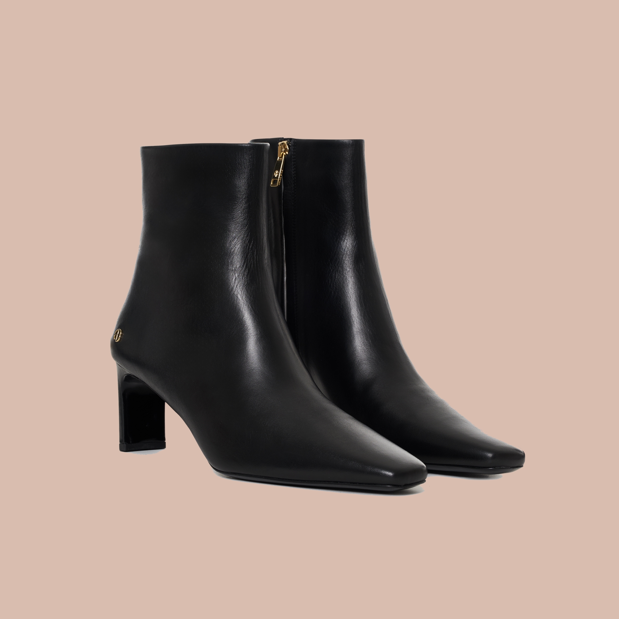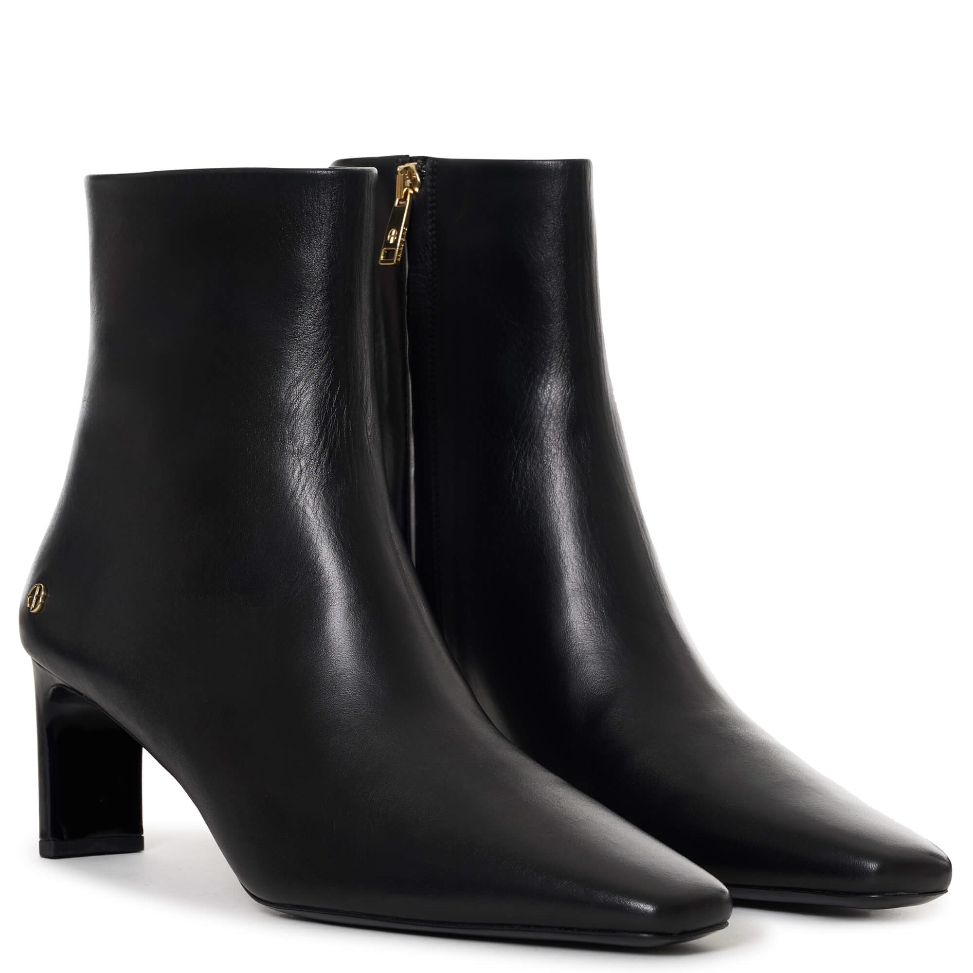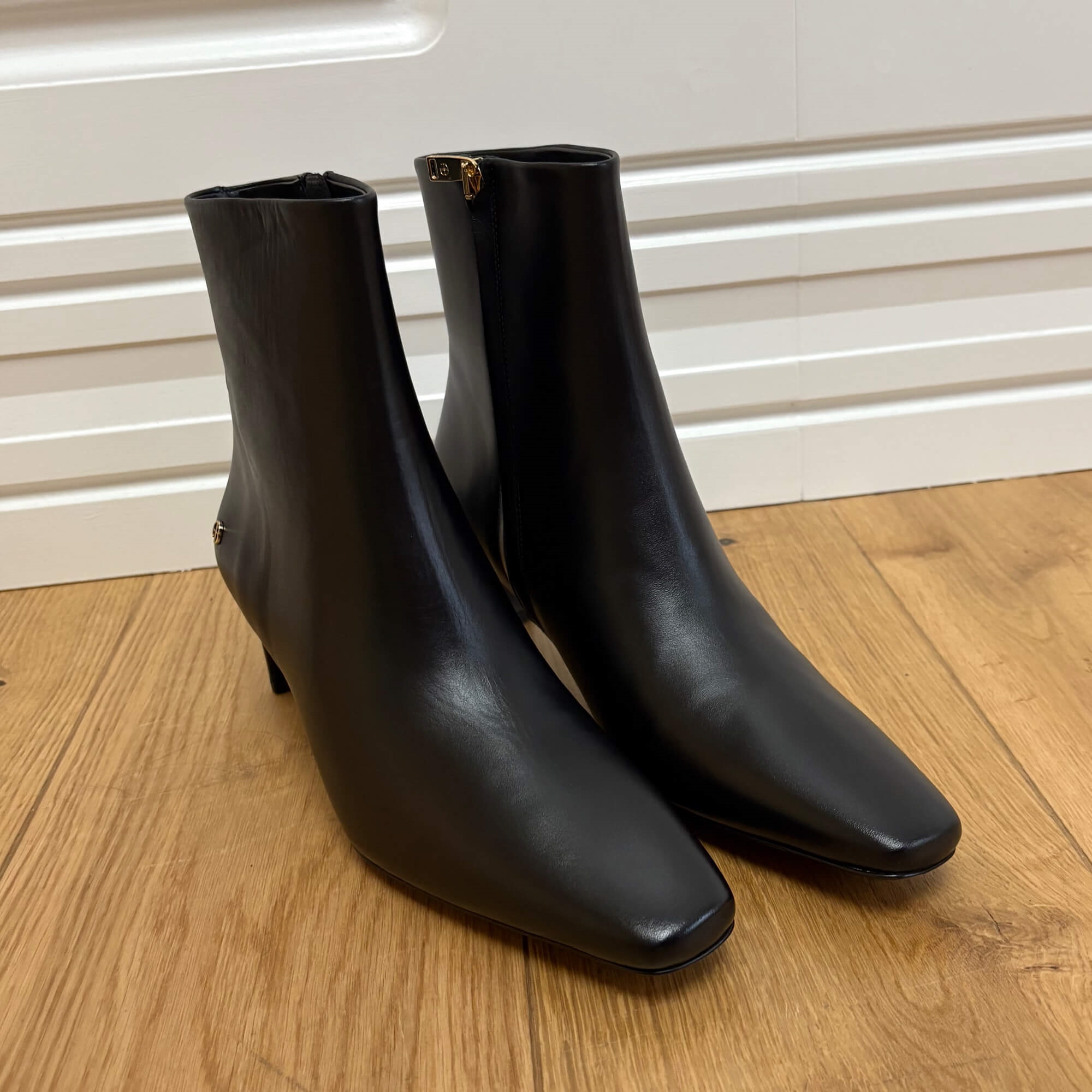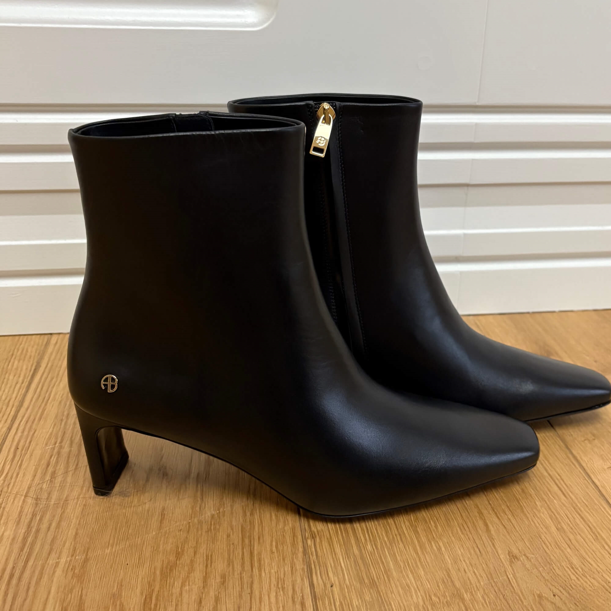 En elegant og tidløs støvlet i glat sort læder fra Anine Bing. Modellen har en slank silhuet med spids snude og en mellemhøj hæl, der giver et sofistikeret og feminint udtryk. Skaftet er ankelhøjt og sidder tæt omkring benet, hvilket skaber et skarpt og moderne look.