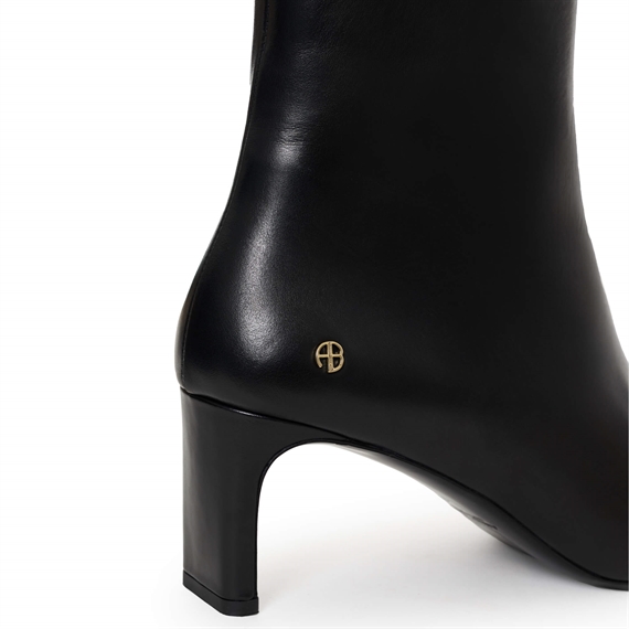 På ydersiden ses et diskret AB-logo i guldfarvet metal som et eksklusivt, men underspillet detaljepunkt. Støvlen har en glat finish uden synlige sømme, hvilket understreger det minimalistiske design, som Anine Bing er kendt for.