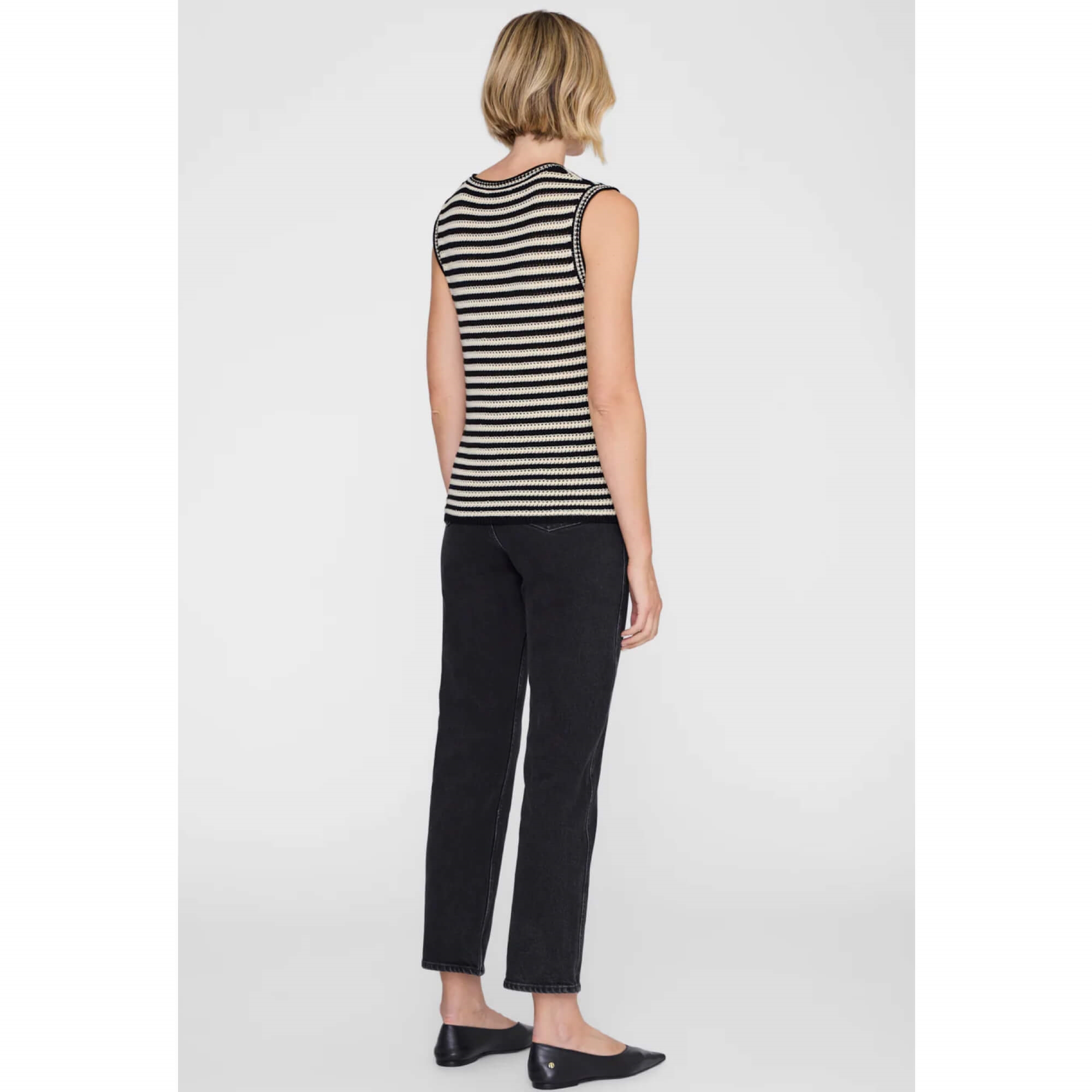 Lowen Sweater er en elegant og alsidig strik, designet med fokus på rene linjer og tidløse detaljer. Den flatterende V-udskæring og det ærmeløse snit skaber en let og sofistikeret silhuet, mens kontrastkanter tilfører et skarpt og moderne udtryk. Den klassiske sort- og cremefarvede strib kombineret med den fine strikkede tekstur giver et stilfuldt og raffineret look med et strejf af parisisk inspiration. Pasformen er enkel og strømlinet, hvilket gør den nem at style - Både med skræddersyede bukser for et mere poleret udtryk eller med afslappet denim til hverdagen. En ubesværet og stilren tilføjelse til garderoben, der balancerer komfort og elegance.