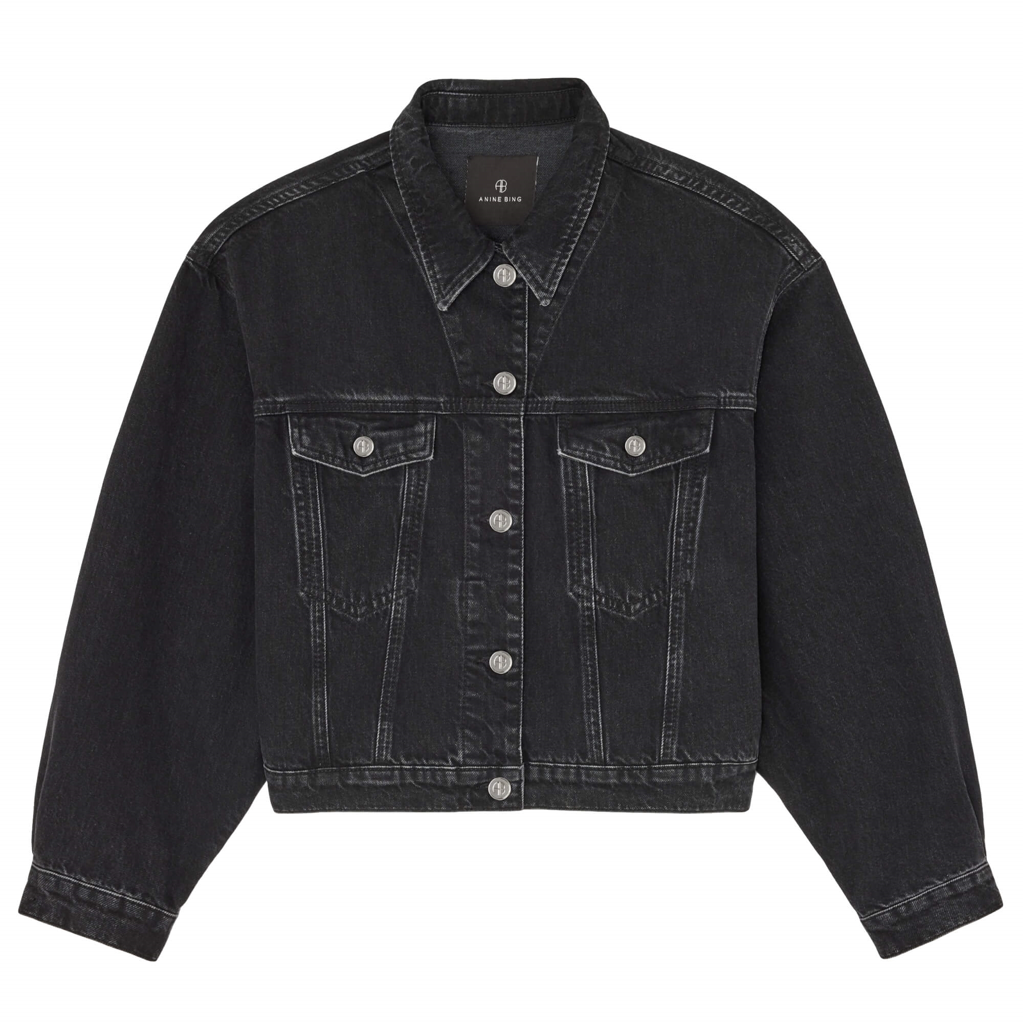 Quincy Jakke fra Anine Bing er en denimjakke i kraftig denim med et vintage-inspireret udtryk. Jakken har skjortekrave, lange ærmer og knaplukning samt brystlommer og synlige syninger. Den er udført i en vasket sort farve, som giver jakken et råt og enkelt look og gør den nem at style til hverdagsbrug. Jakken har et cropped fit med en lige silhuet. Normal i størrelsen.