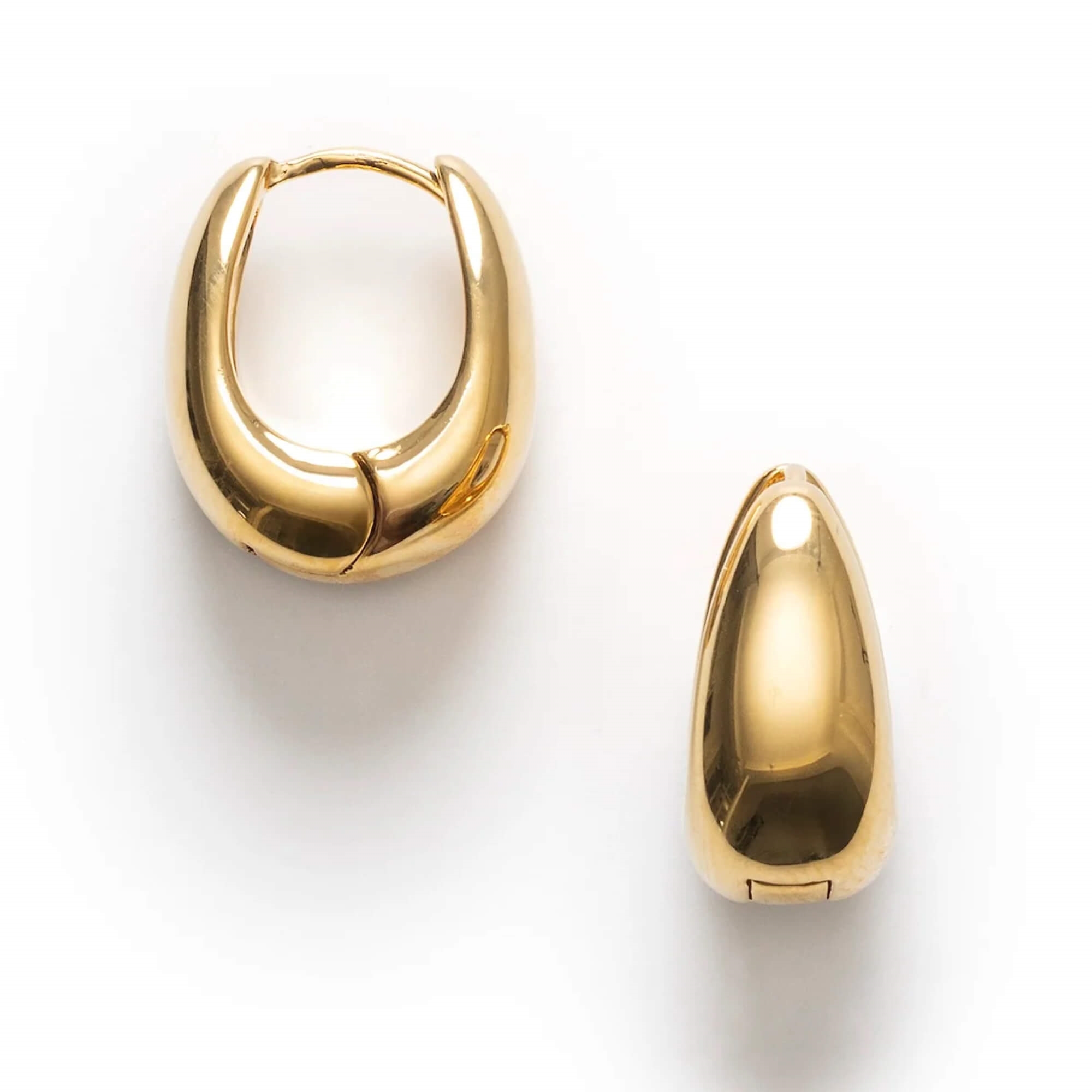 Øreringene er lavet i messing med 18 karat guldbelægning og har en beskyttende anti-tarnish e-coating, som hjælper med at holde dem pæne over tid. De måler 26 x 21 mm, har en bundbredde på 10 mm og sælges som et par.