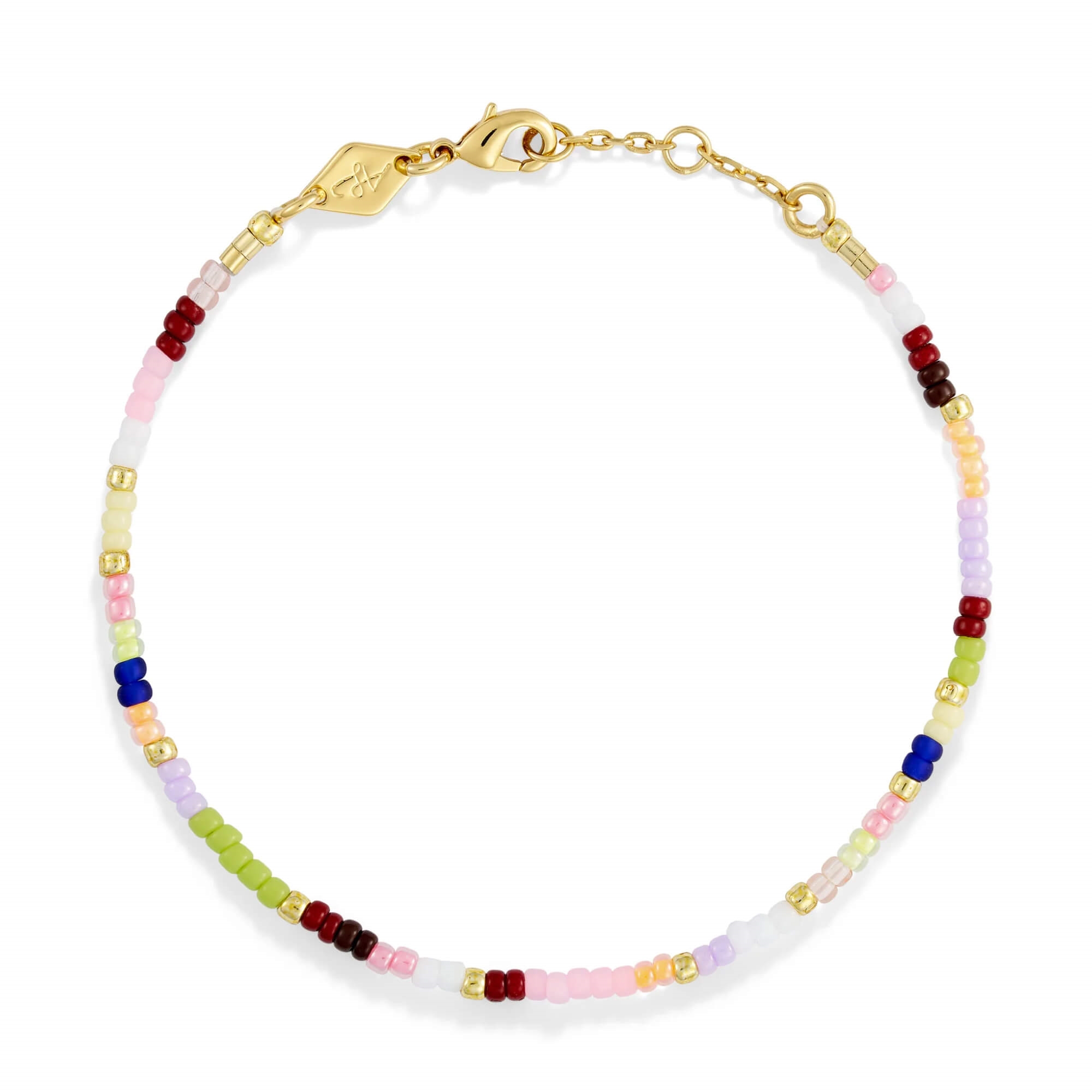 Det skønne Oasis Eldorado armbånd i Guld er dekoreret med ædelsten, ferskvandsperler og glasperler, som giver et legende og farverigt udtryk. Armbåndet er lavet af messing med 18-karat guldbelægning og en anti-anløbende e-belægning. Det kan justeres fra 16,5 til 21 cm og lukkes nemt med en lås.