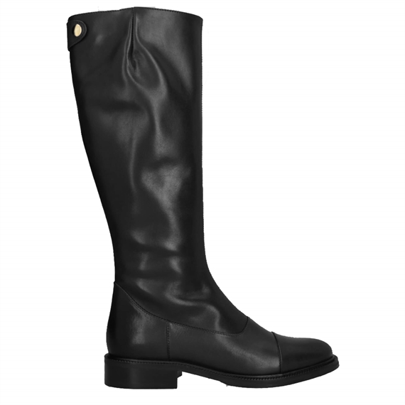 Håndlavet langskaftet støvle, udført i sort glat skind. Støvlen har en rund tå og en lynlås på indersiden. Støvlen har dekorative syninger og en dekorativ knap øverst på bagsiden. En ikonisk langskaftet Billi Bi klassiker.