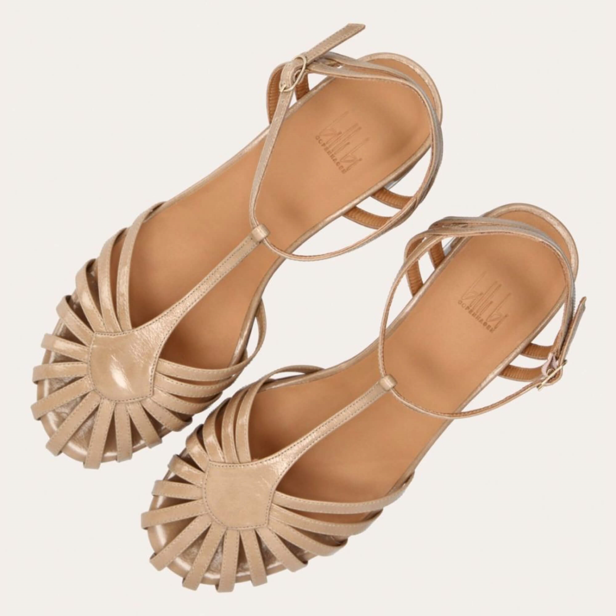 Håndlavet sandal på hæl fra Billi Bi, udført i beige lakeret skind med rund, åben tå. Sandalens front er designet med en T-rem og flere tynde stropper, som skaber en elegant og feminin silhuet. Omkring anklen sidder to remme, der fuldender det raffinerede udtryk. Den justerbare ankelrem lukkes med et guldspænde, og sandalen har en mellemhøj blokhæl.