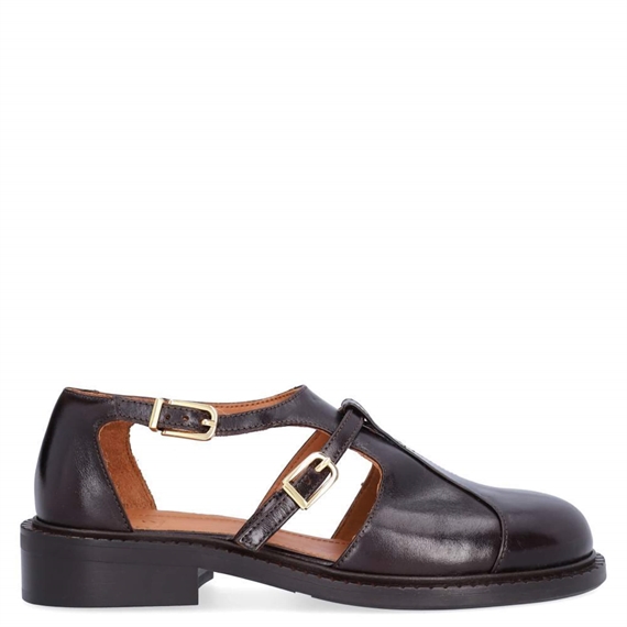 Håndlavet sko fra Billi Bi, udført i mørkebrunt læder med firkantet tå. Farven er en varm, smuk kastanje-brun, en signatur-nuance i deres nye forårskollektion. Skoen er dekoreret med en dobbelt hul-detalje henover vristen, som lukkes med finestes guldspænde to steder i den ene side.