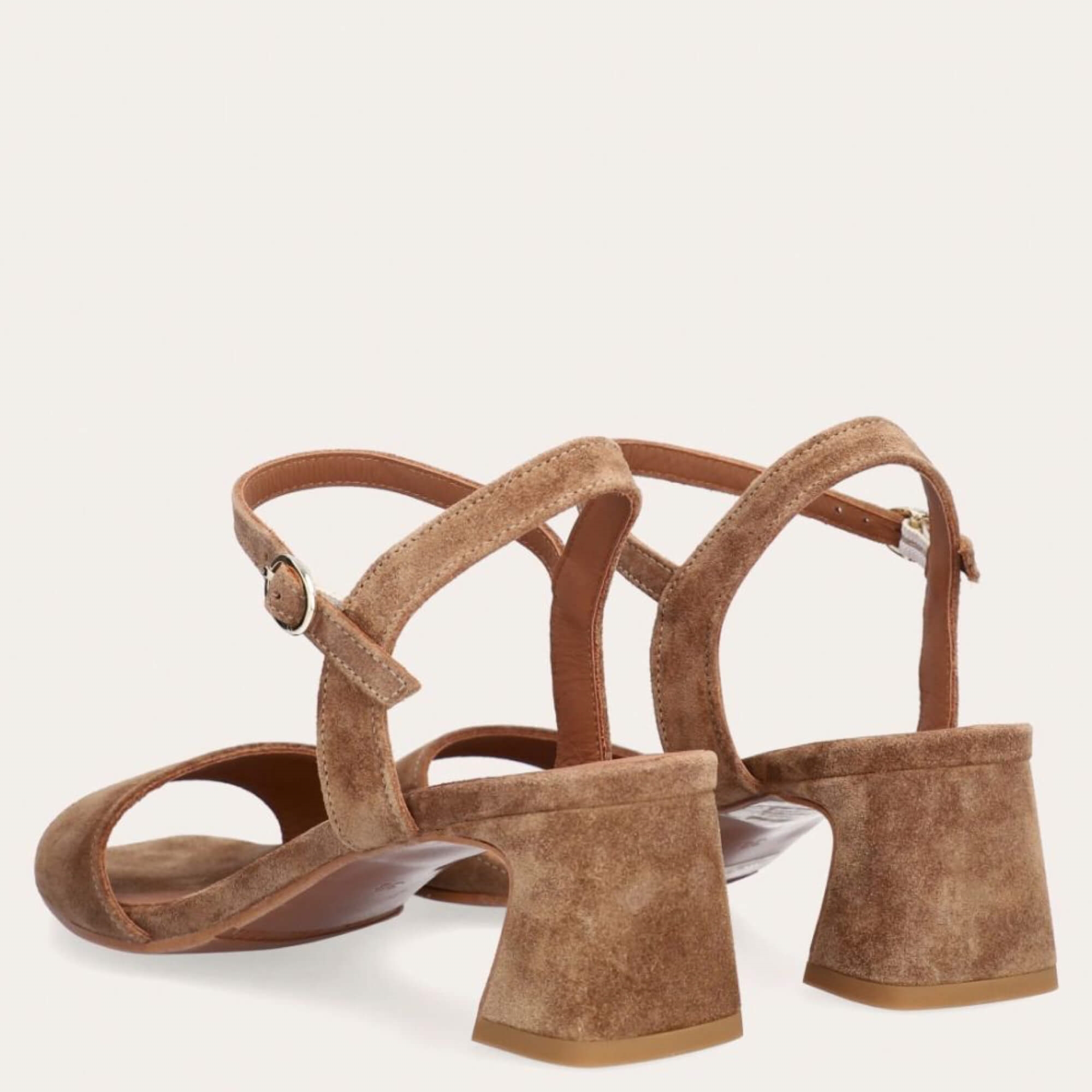De smukke A9750 er et par lækre håndlavet sandal på hæl, udført i lysebrunt ruskind med firkantet tå. Sandalen har en elegant, enkelt formet forstykke og en skindbetrukket blokhæl. Den justerbare ankelrem lukkes med et sølv spænde.