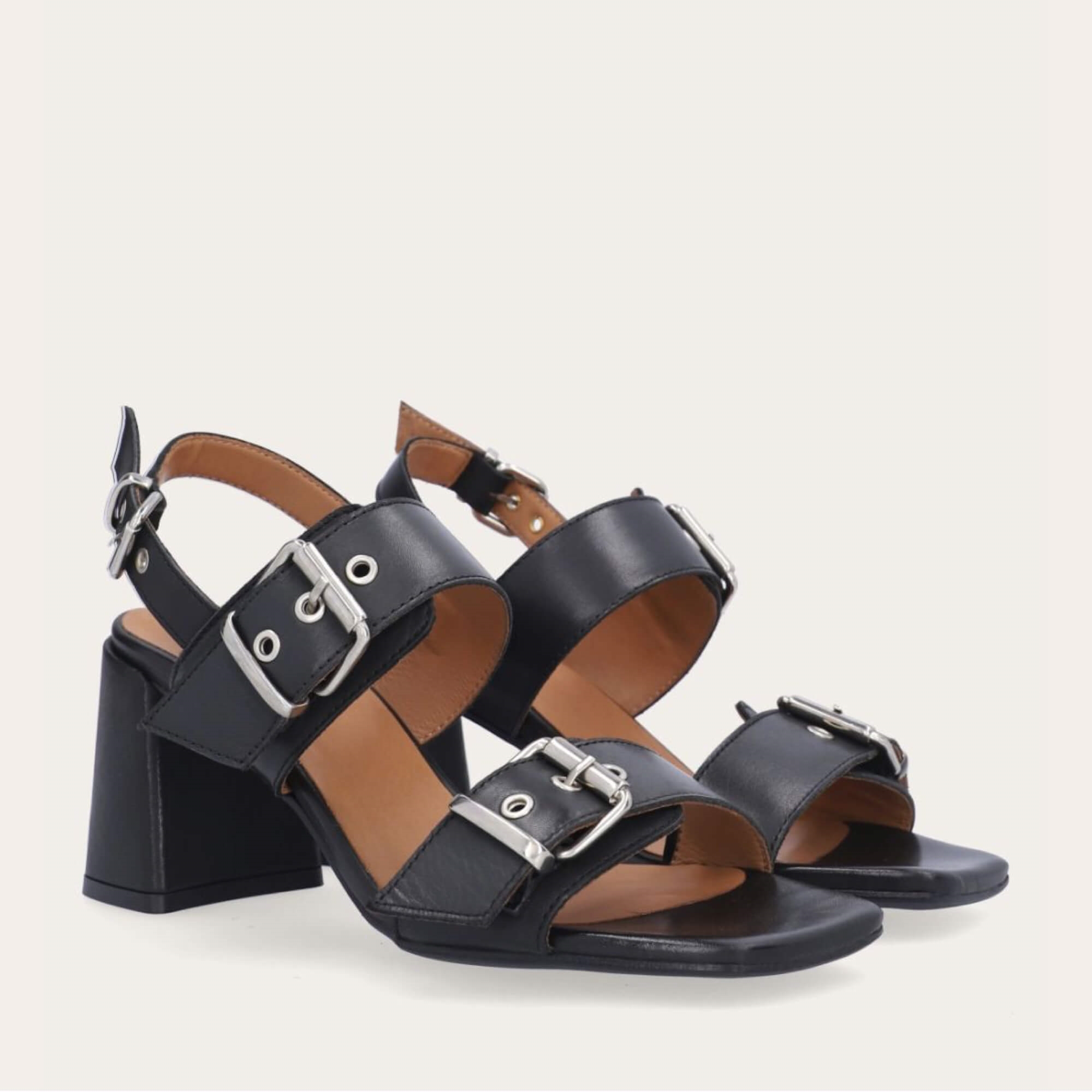 Håndlavet slingback sandal i sort, glat skind med firkantet tå. Sandalen har to stropper over foden og en rem rundt om anklen med sølvspænder. Den høje blokhæl er betrukket med skind og giver et stilrent og elegant udtryk.