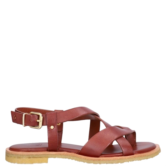 Den smukke T8012 er en håndlavet sandal i brunt glat skind med rund tå. Designet har krydsremme over forfoden, en rem mellem tæerne og en justerbar ankelrem med gyldent spænde. Sandalen er lavet med en fleksibel rågummisål, der giver god komfort og et naturligt greb. En let og luftig sandal, der er perfekt til varme sommerdage.