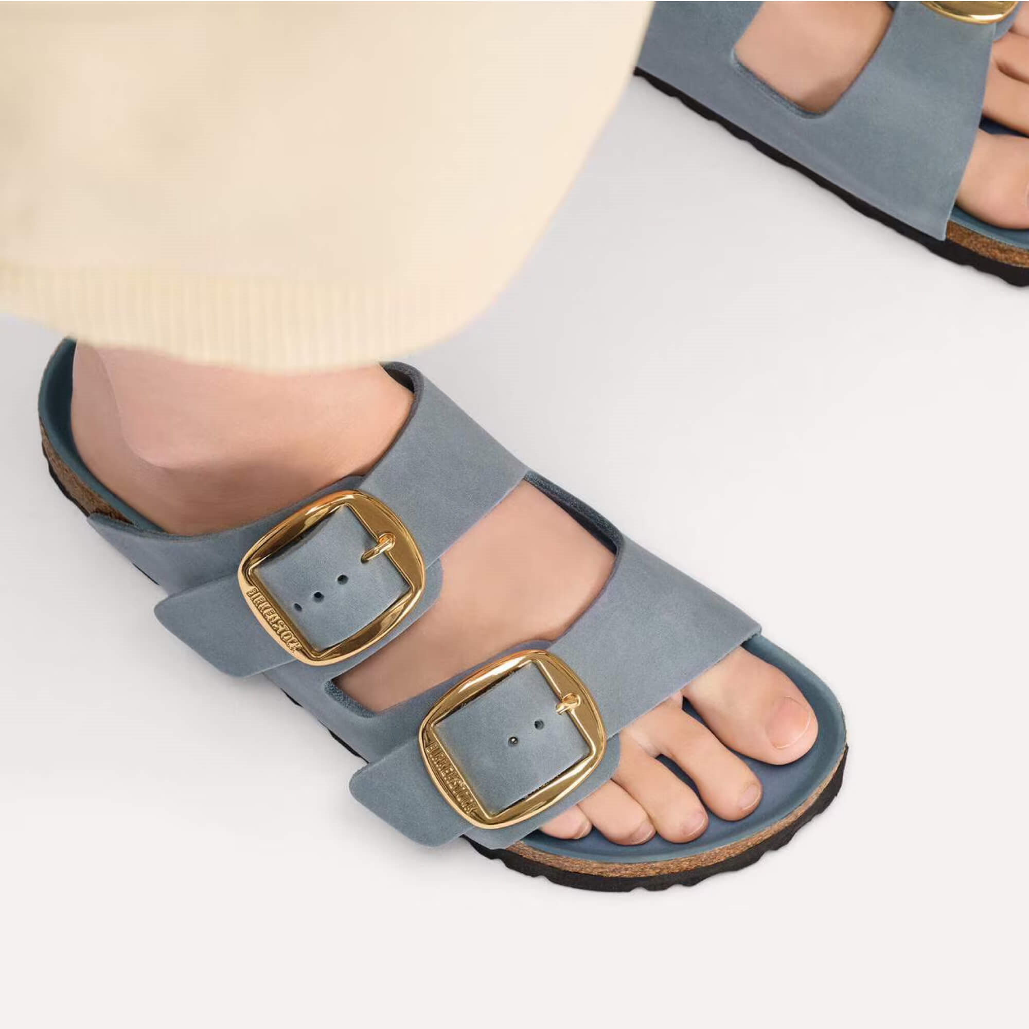 Arizona modellen fra Birkenstock er en ægte klassiker med sit tidløse design som mange er rigtig glade for! Den nye fine udgave 'Big Buckle' kommer med et stort elegant dornspænde i guld – et flot blikfang på en ellers enkel sandal og som samtidigt giver dem et feminint touch. Overmaterialet består af det skønneste nubuklæder i høj kvalitet, der appellerer med sit naturlige, rustikke udseende. Din nye favorit sandal fra Birkenstock den gang i den smukke Basalt Gray farve!