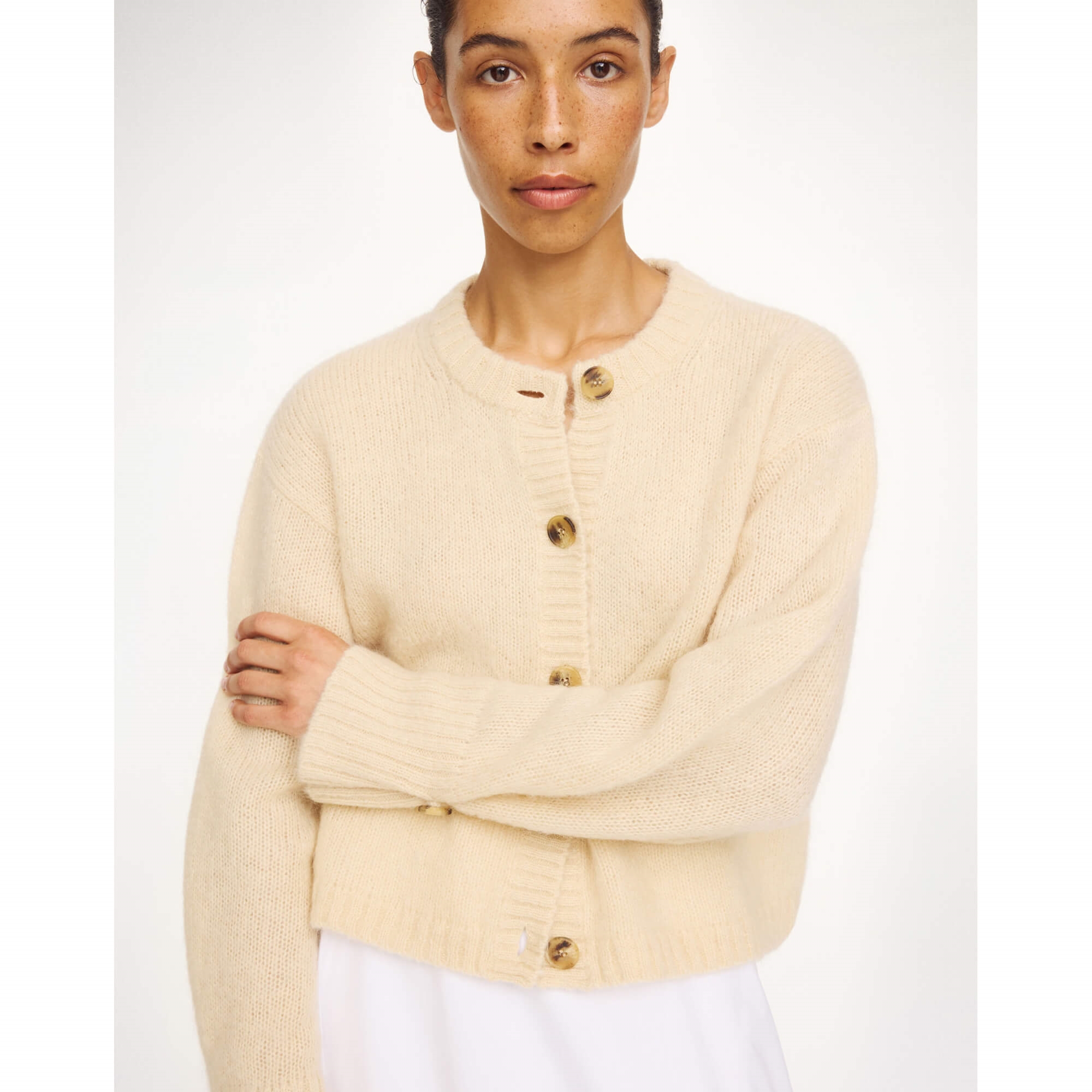 Den skønne Cierrou er en blød cardigan i uld- og mohairmix - Perfekt til overgangssæsonen. Designet har en let cropped silhuet med løs pasform, rund hals og knaplukning. De forlængede ærmer og ribkanter giver et afslappet, men stilfuldt udtryk.