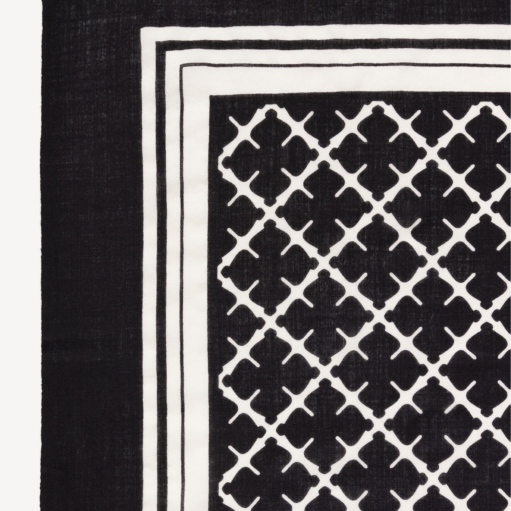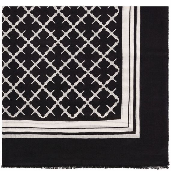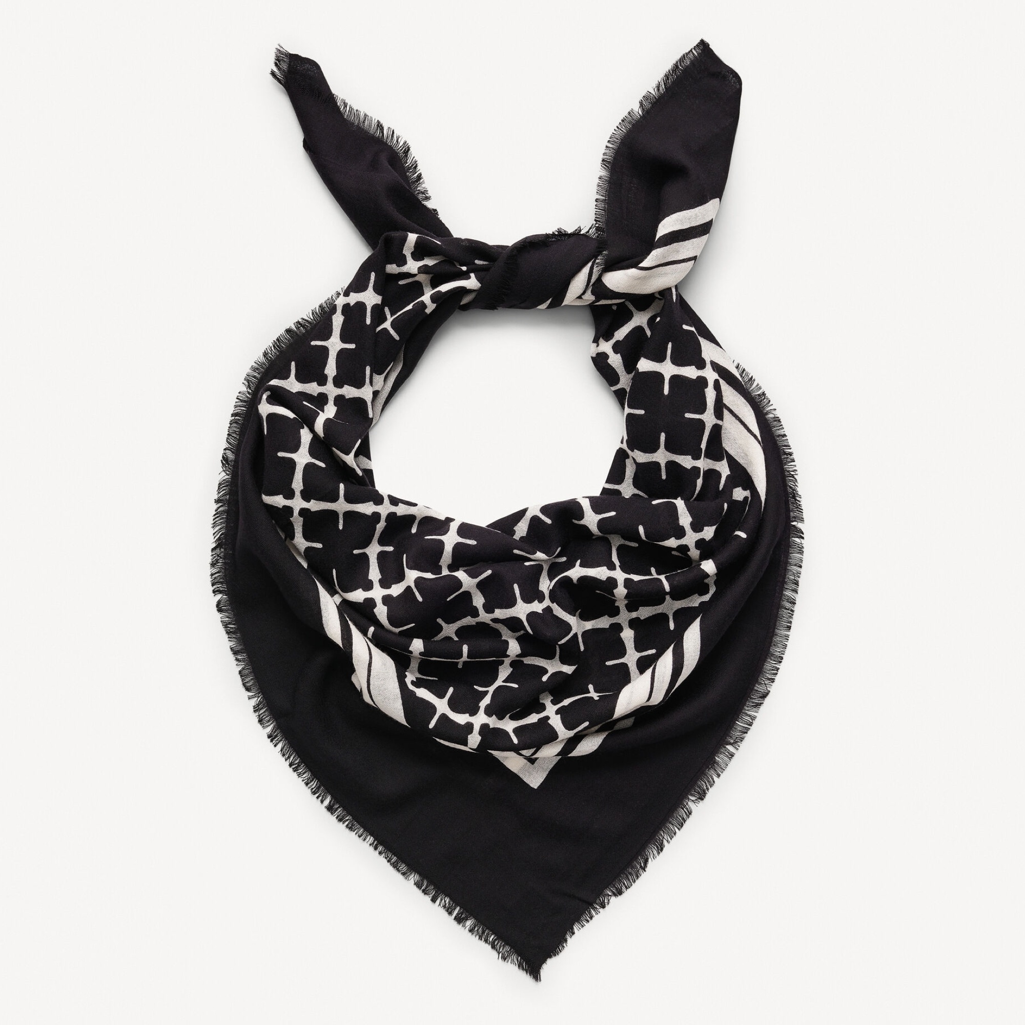 Det sorte mønster er smukt dekoreret med brandets ikoniske Signature Flower-motiv og afsluttes med rå, frynsede kanter, der tilfører et eksklusivt og håndlavet udtryk. Brug det snoet om halsen eller elegant draperet over skuldrene for et sofistikeret look med kant.