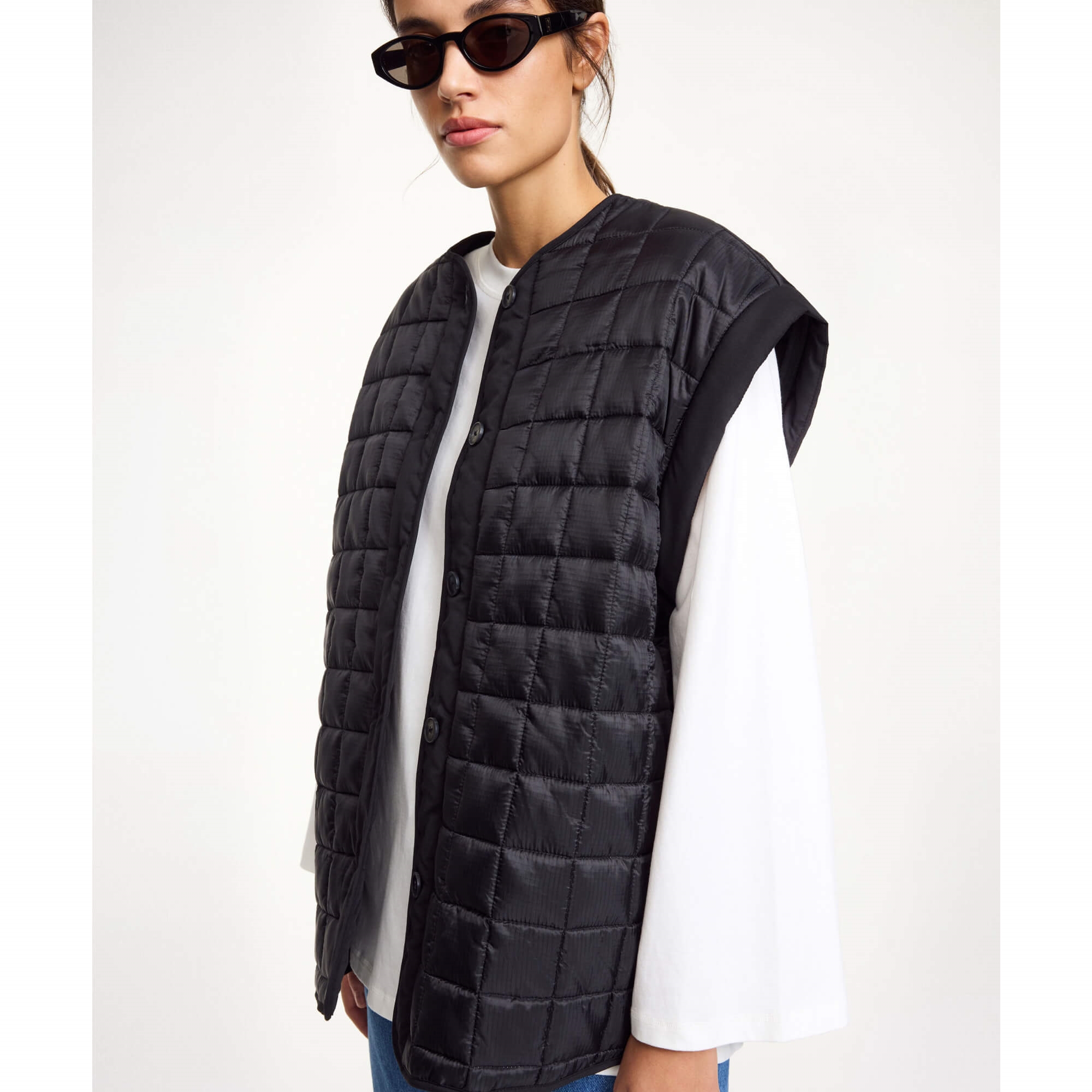 Den skønne quiltet Edith jakke er med alsidig funktion som både jakke og vest - Ideel til skiftende vejr. Modellen har en oversized pasform, går til under hoften og er uden krave for et moderne udtryk. Den lukkes med diskrete knapper og har skjulte sidelommer samt aftagelige ærmer, så du nemt kan tilpasse looket til både hverdag og weekend.
