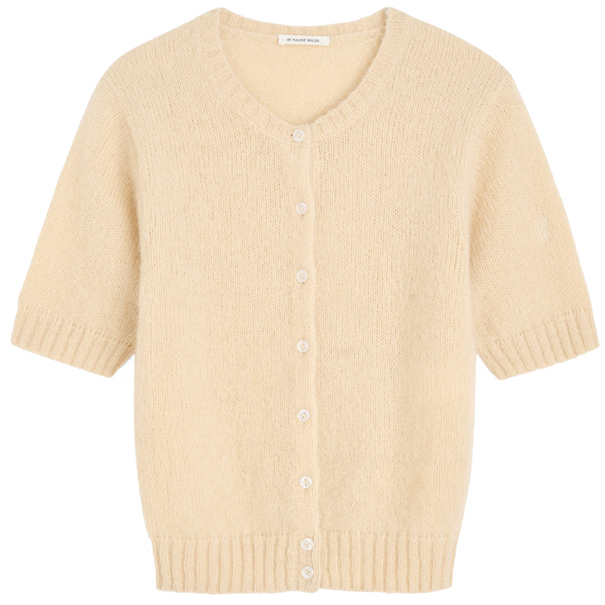 Myrtilla Soft cardiganen fra By Malene Birger er det perfekte lag til sæsonens lune, men omskiftelige dage. Cardiganen er strikket i en blød mohairblanding, der føles let og luksuriøs mod huden, og har et tidløst design med korte ærmer, rund hals og klassisk knaplukning. Ribkanter giver et elegant og velafbalanceret finish.