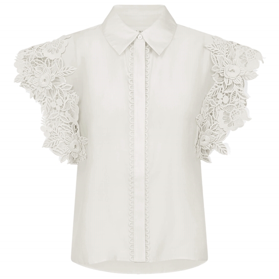 CMMOLLY-SHIRT er en feminin skjorte i et lækkert premiummateriale. Den har skjult knaplukning med fine broderede kanter og en lille fold i kraven. De korte ærmer er dekoreret med en diskret broderet blomstertekstur, som giver et elegant og let udtryk. En enkel og stilfuld skjorte, der passer til både hverdag og pænere brug.