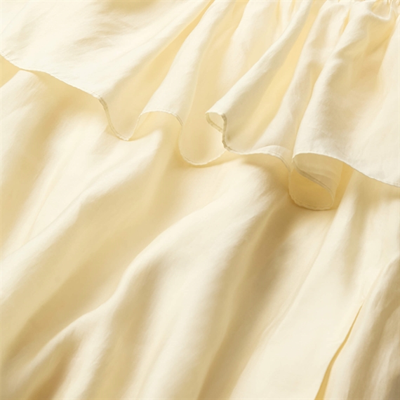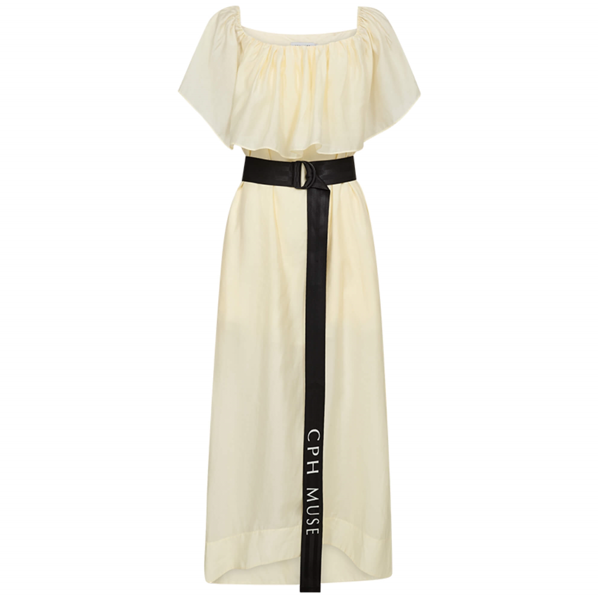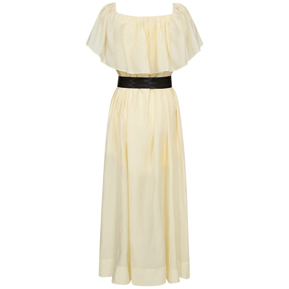 Smuk og feminin kjole fra Copenhagen Muse i en flot forårsgul nuance. CMMOLLY kjolen har en let og luftig pasform med feminine flæsedetaljer ved skuldrene, som giver et elegant og sommerligt udtryk. Den brede kontrastbælte i sort fremhæver taljen og tilføjer et moderne twist til det enkle design.