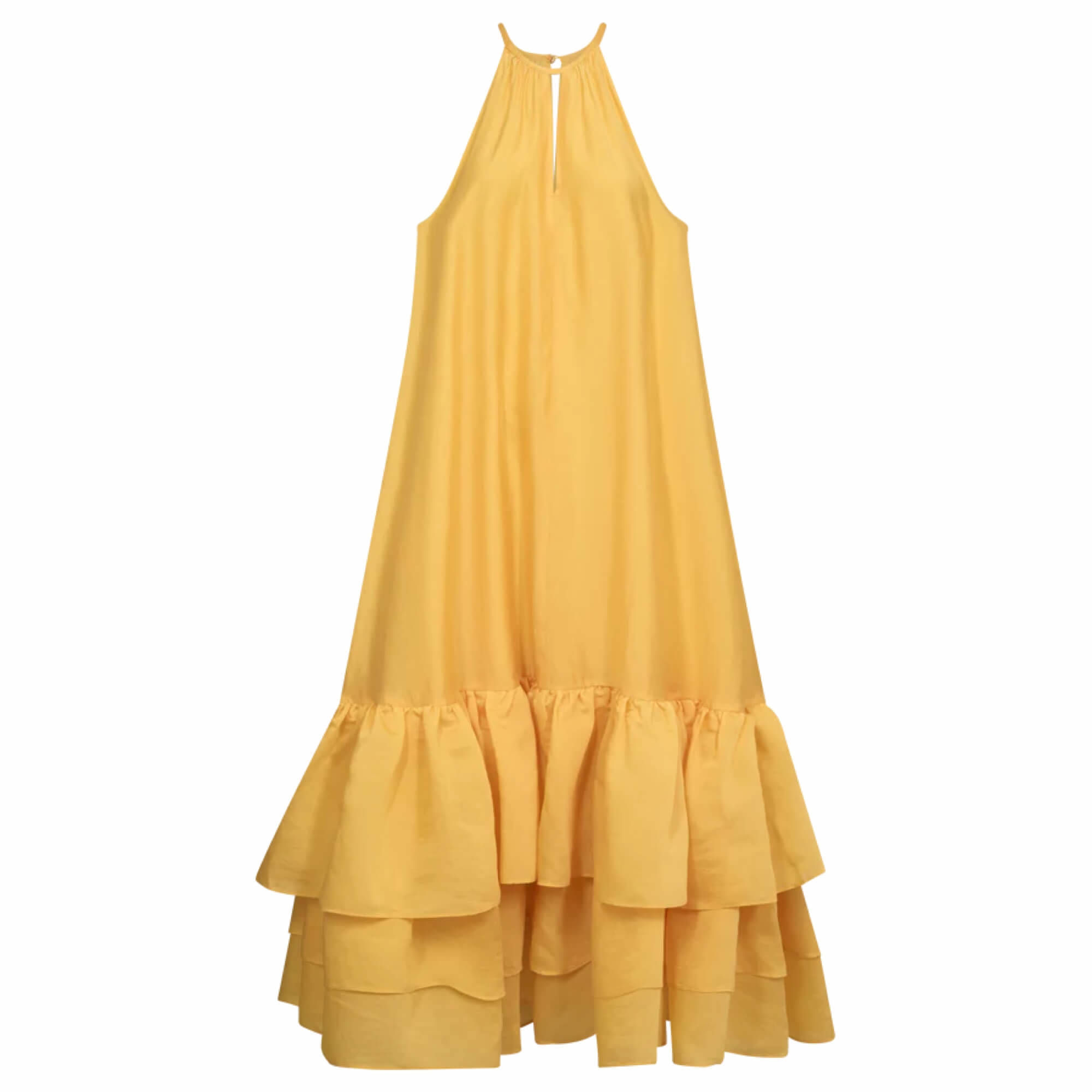 CMMOLLY-DRESS er en lang, voluminøs kjole i en let vævet lyocellblanding med et blødt og elegant fald. Designet har halterneck med en smal V-udskæring foran og bagpå samt fine rynker ved halsen, der skaber et feminint udtryk. Kjolen har en A-formet silhuet med smuk vidde og en lag-på-lag flæsekant, som giver ekstra bevægelse. Den lukkes med små stofbetrukne knapper i nakken og er fuldt foret med diskrete sidelommer for optimal komfort.