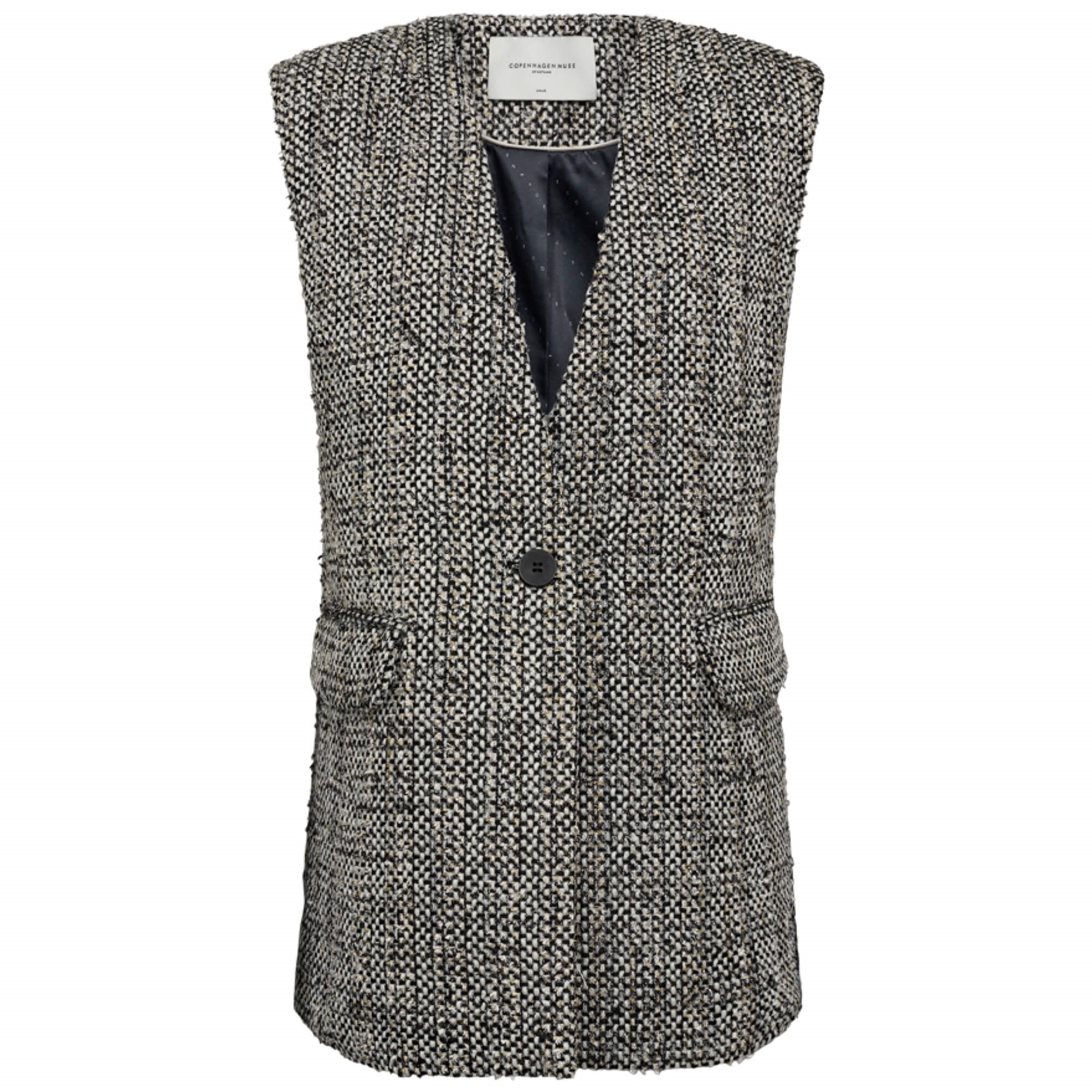 Denne fine vest fra Copenhagen Muse har et elegant, struktureret look med et vævet mønster i nuancer af sort, hvid, guld og sølv, hvilket giver et klassisk tweed-inspireret udtryk. Designet er ærmeløst og har en lige, let figursyet pasform. Den lukkes med en enkelt sort knap foran og har to dekorative klaplommer i taljehøjde, som tilføjer et sofistikeret touch.