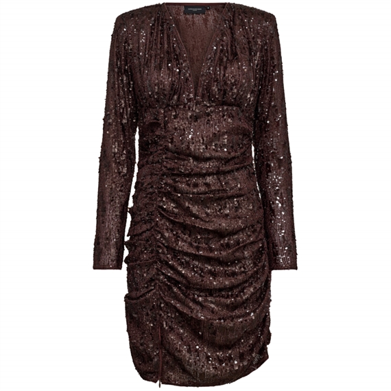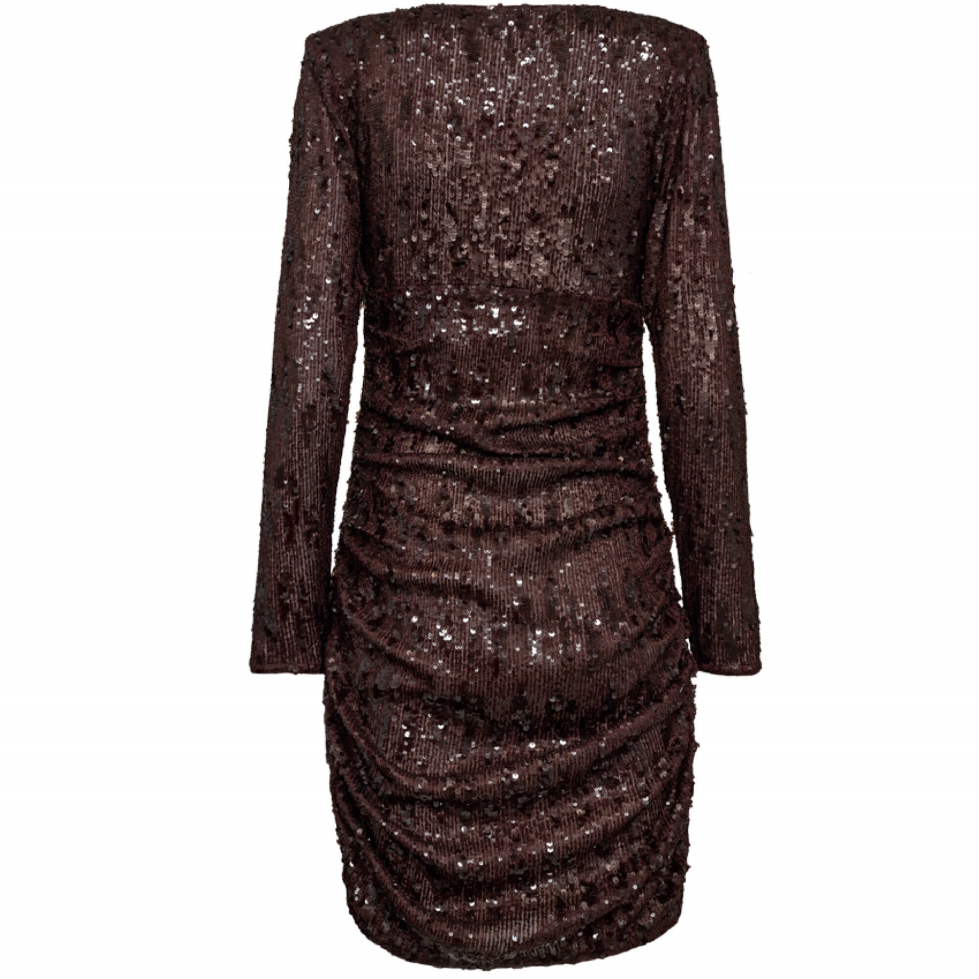 Glitrende elegance møder moderne silhuet i CMSEQUINCE kjolen fra Copenhagen Muse. Denne smukke kjole er dækket af funklende pailetter i den dybe brunlige nuance