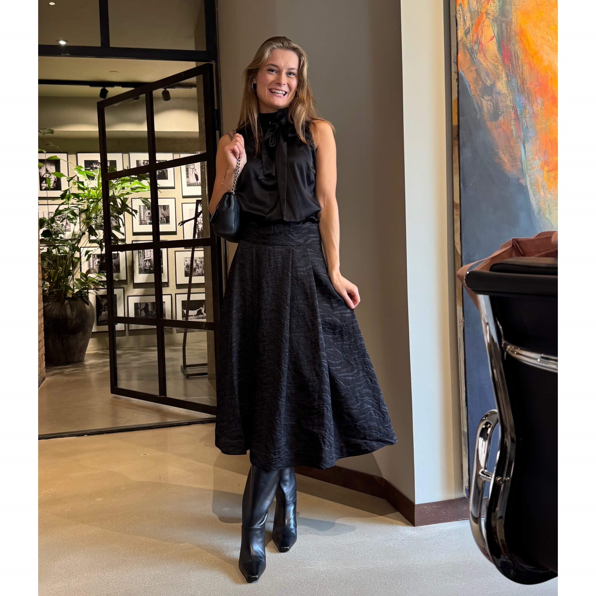 ALBISDEA nederdel fra Dea Kudibal - en skulpturel A-formet nederdel i en struktureret, sort jacquard. Den eksklusive vævning har et diskret, bølgende mønster, der tilføjer dybde og luksus til den klassiske silhuet. Den høje talje og de brede læg skaber en flatterende pasform, mens det kraftige stof sikrer et smukt fald og en stilfuld volumen. Perfekt til både hverdag og fest - style den med en enkel silkebluse og hæle for et sofistikeret udtryk, eller med chunky strik og støvler til en moderne hverdagsstil.