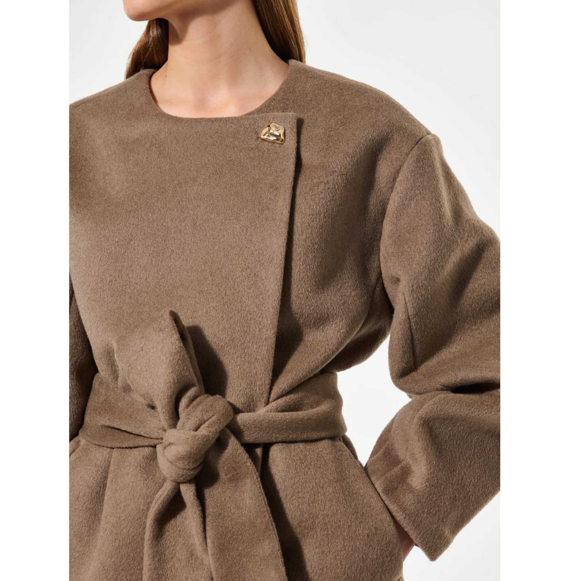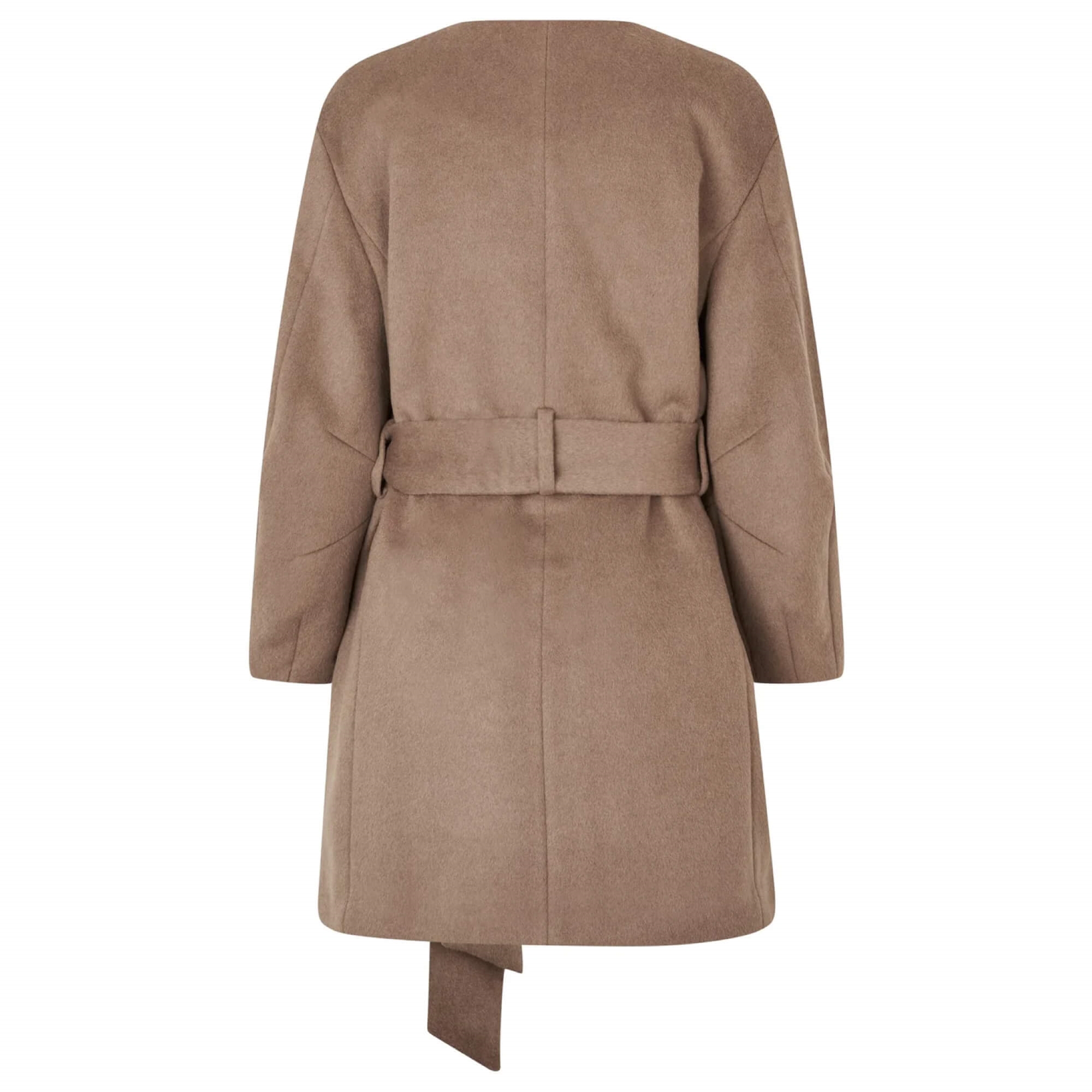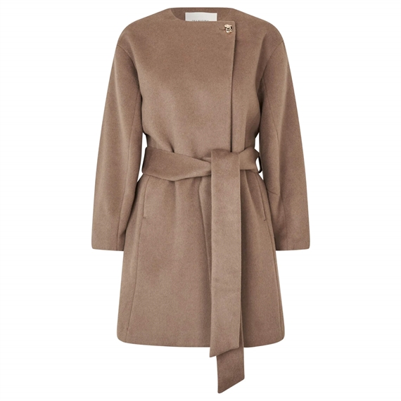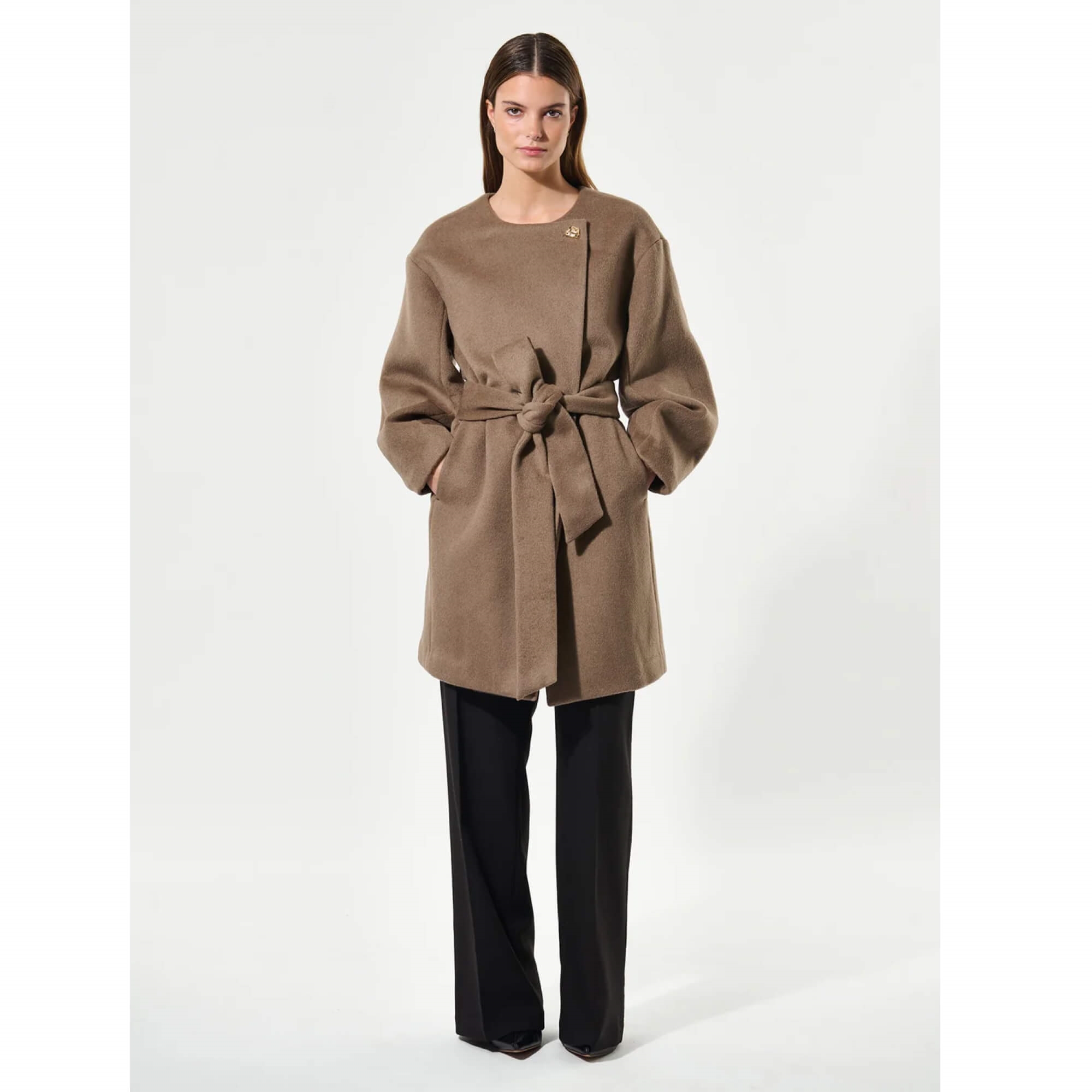 Denne stilrene beige frakke uden krave udstråler moderne elegance. Den asymmetriske front lukkes med en enkelt dekorativ knap ved skulderen, som giver et raffineret udtryk. De skulpturelle ’kokon’-ærmer og stiklommer i sidesømmene tilføjer et sofistikeret touch, mens bæltet i samme stof fremhæver taljen. Frakken er fuldt foret og har en flatterende længde, der falder lige over knæet.