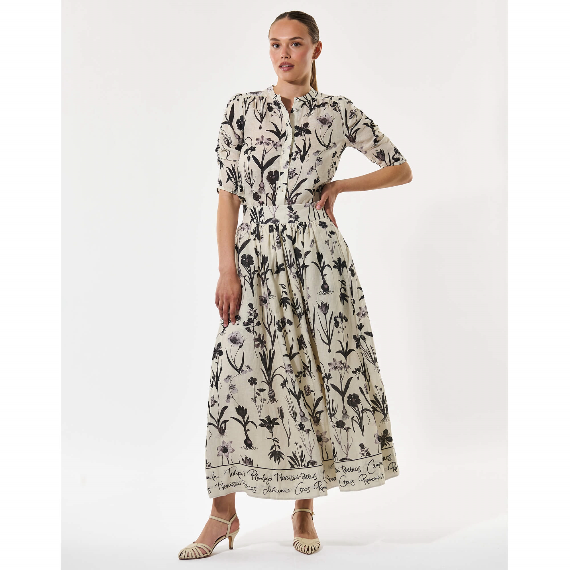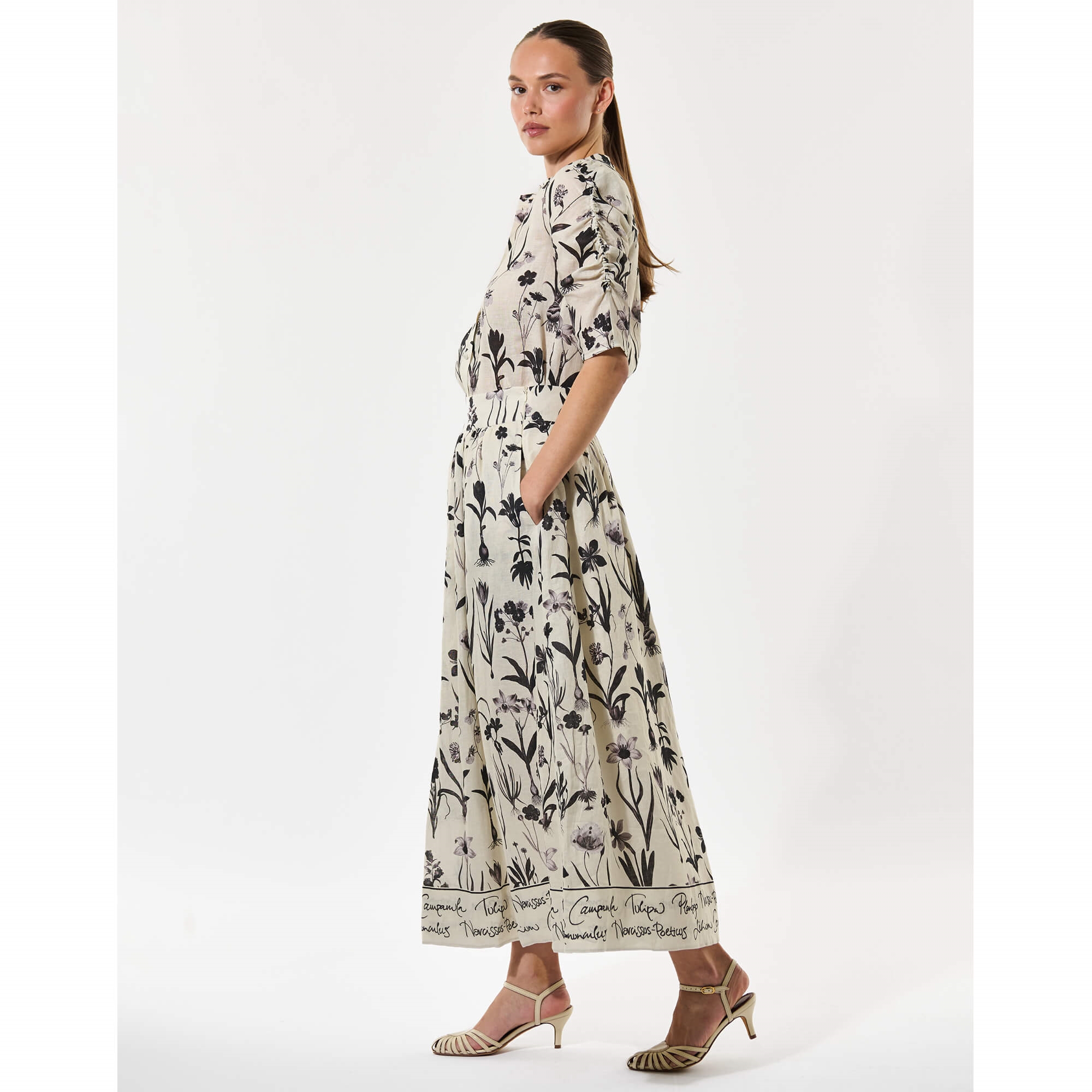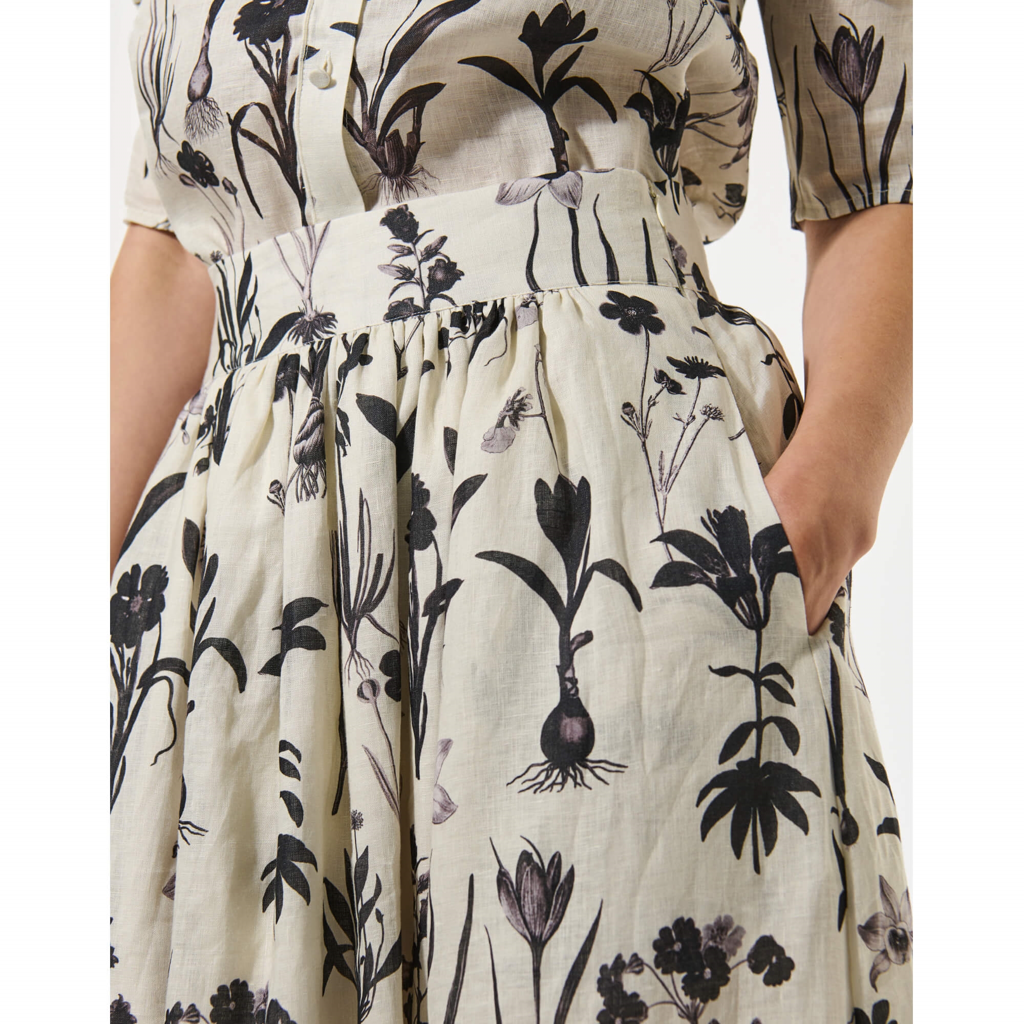 EddaDEA Nederdelen i Botanical er en smuk og feminin hørnederdel, perfekt til varme sommerdage. Det markante blomsterprint giver nederdelen masser af liv, mens den brede, høje talje skaber en flot og behagelig pasform. Nederdelen falder elegant i en fuld, vid silhuet, der stopper ved læggen og giver et let og luftigt udtryk. Den er fuldt foret for ekstra komfort og har praktiske sidelommer, som tilfører et afslappet og moderne touch. Style den med en enkel top eller en let skjorte for et feminint sommerlook, der fungerer både til hverdag og særlige lejligheder.