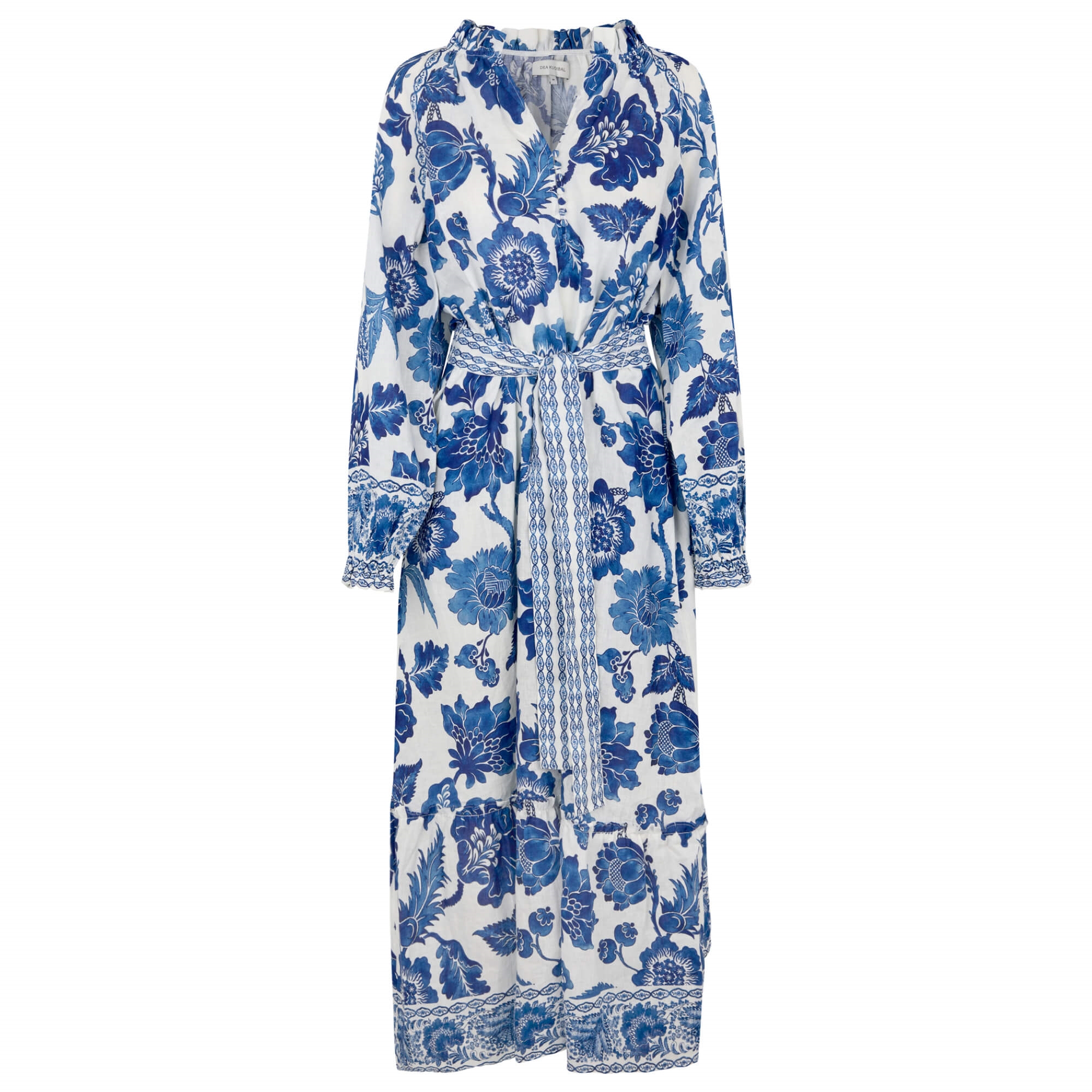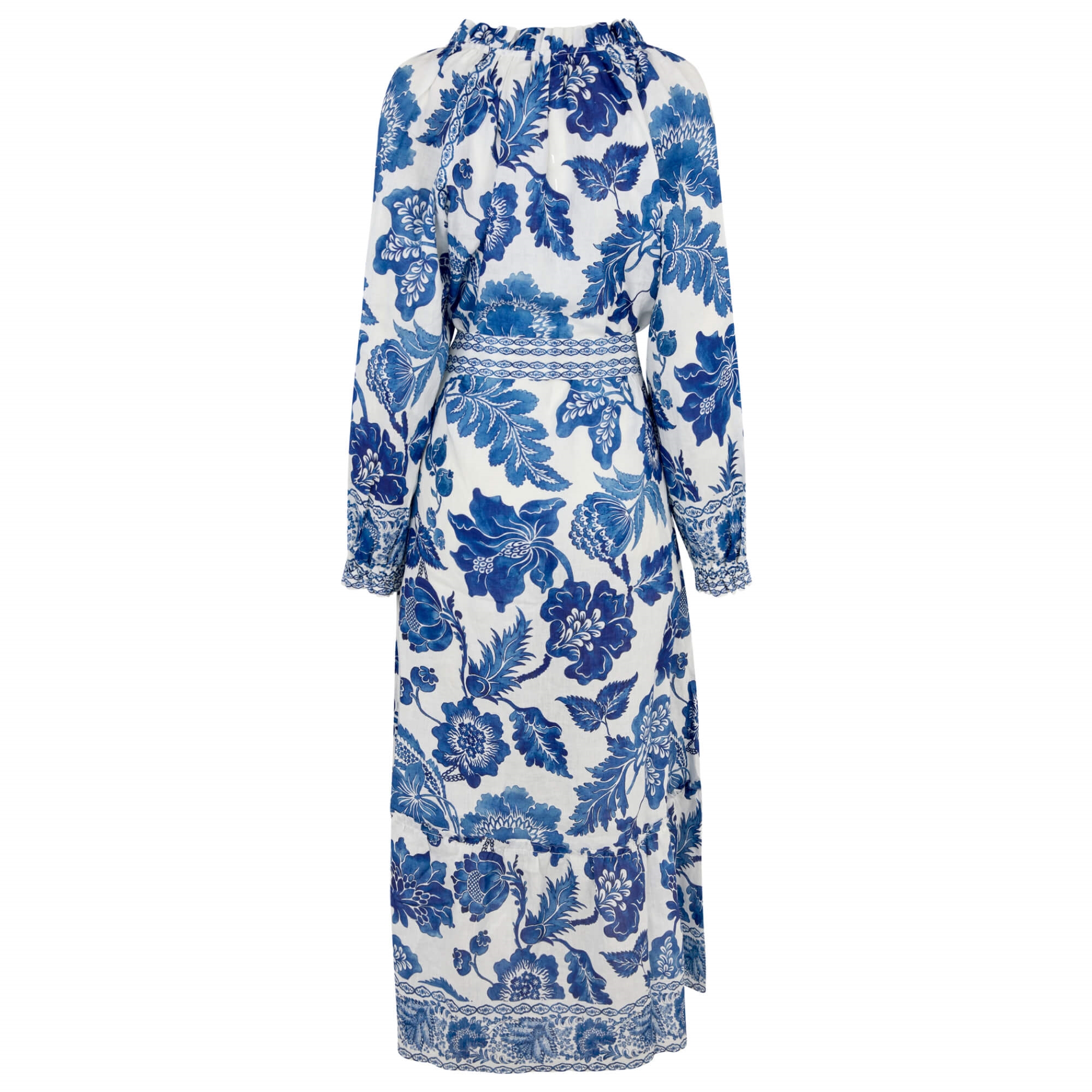 IdaniaDEA Kjole fra Dea Kudibal er en smuk, gulvlang kjole i let hør, dekoreret med store, eksotiske blå blomster, der giver et feminint og eksklusivt udtryk. Den har et regular fit, som let kan formes i taljen med det medfølgende bindebælte. Fine flæsedetaljer langs kraven, små betrukne knapper samt kontrastkanter ved ærmer og kant fuldender det elegante look. Kjolen leveres med underkjole for ekstra komfort og et smukt fald. En perfekt kjole til både sommerens begivenheder og særlige anledninger.