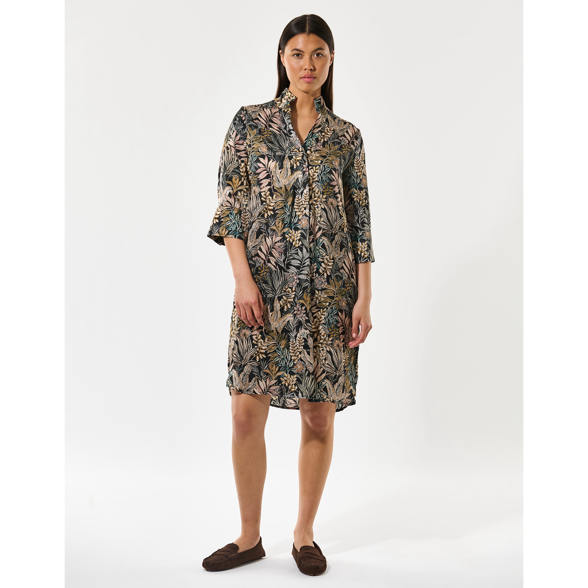 KAMILLE kjolen fra Dea Kudibal i det smukke nye Sencha Black print er perfekt til dig, der vil sætte kulør på enten hverdagen eller den kommende fest. Den fine kjole er dejlig behagelig at have på en hel dag eller aften, da den har en løs pasform, 3/4 lange ærmer og V-hals. Brug kjolen med dine yndlingssandaler eller sneakers for et pænt hverdagslook.
