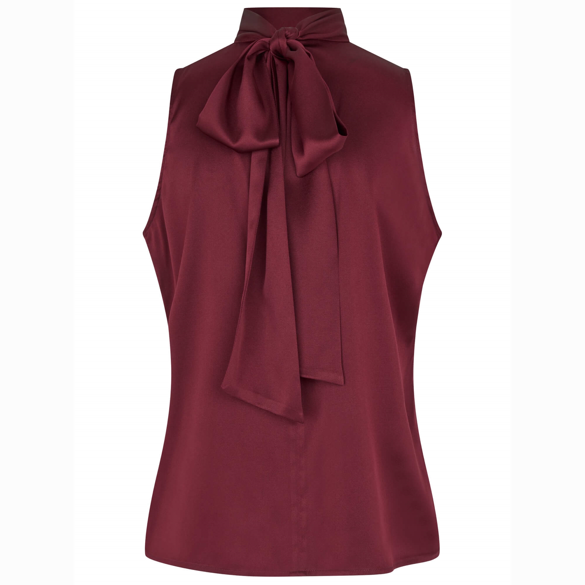 Denne ærmeløse top forener sofistikation og alsidighed i ét design. Fremstillet i bordeux stretch satin med en glansfuld finish, har toppen en normal pasform, der smyger sig elegant om kroppen uden at stramme. Den høje krave munder ud i et integreret tørklæde, som kan bindes på flere måder – som sløjfe, løst knude eller elegant draperet – alt efter anledning og humør. En diskret slids i ryggen tilføjer et moderne, sensuelt touch og bryder det ellers enkle look med en subtil detalje.