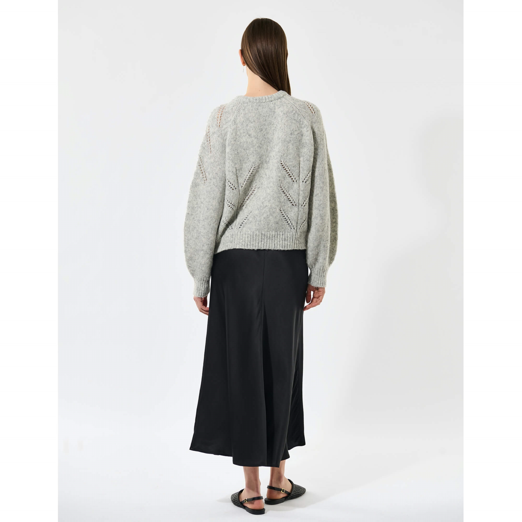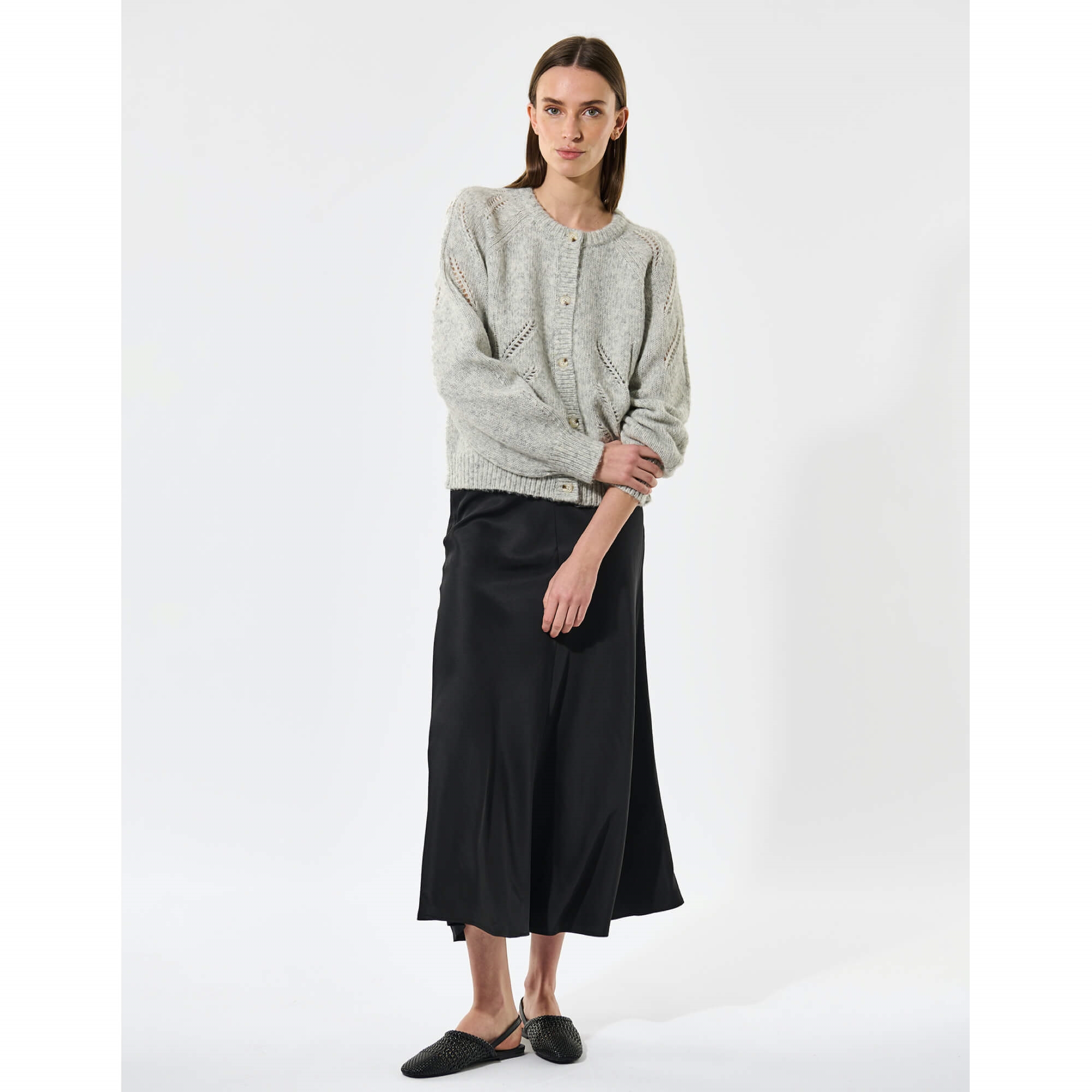 Cardiganen har en rund halsudskæring og voluminøse ærmer, som tilføjer et feminint touch til den afslappede silhuet. Perfekt som et stilfuldt lag over en skjorte, kjole eller let top – et musthave til både hverdag og weekend.