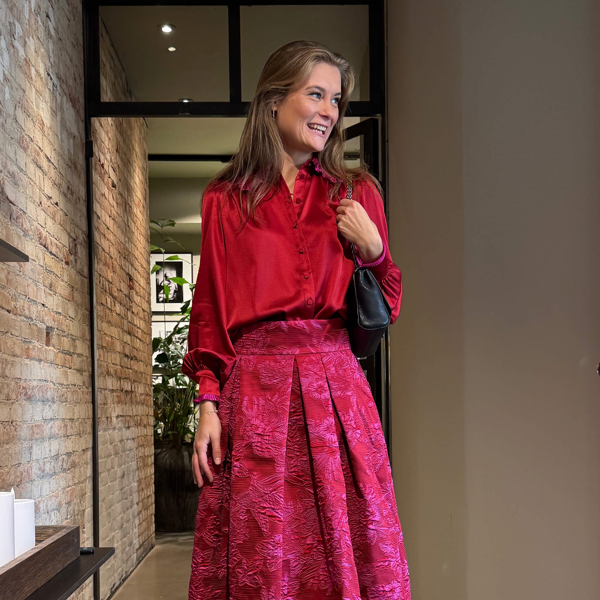 UmaDEA silkeskjorten fra Dea Kudibal er en skøn skjorte i Freesala/Cardinal med de smukkeste detaljer. Den har små læg i pink der løber rundt om kraven og i bunden af ærmerne, der er med til at løfte skjorten til noget særligt.