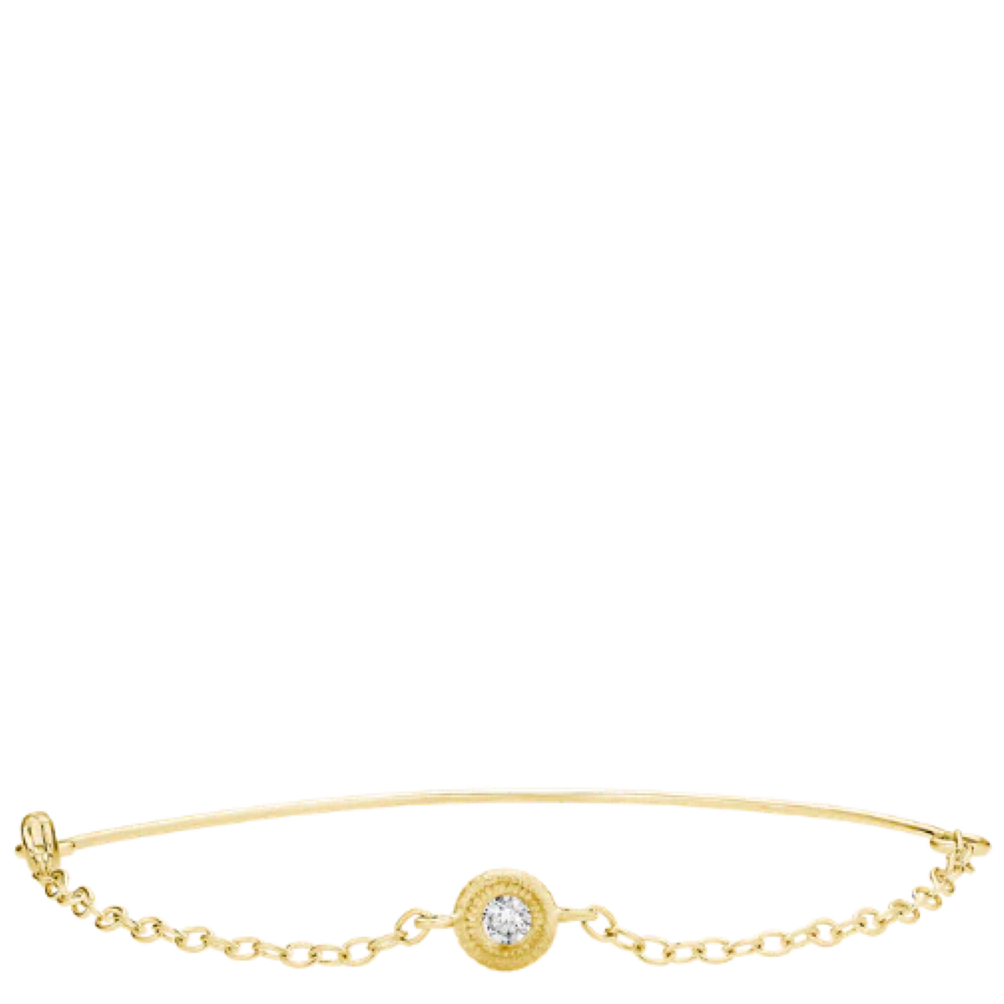 Den buede guldbøjle balanceres af en fin kæde og lås, der holder armbåndet smukt placeret på håndleddet. Diamanten tilfører et diskret punkt af lys til designet.