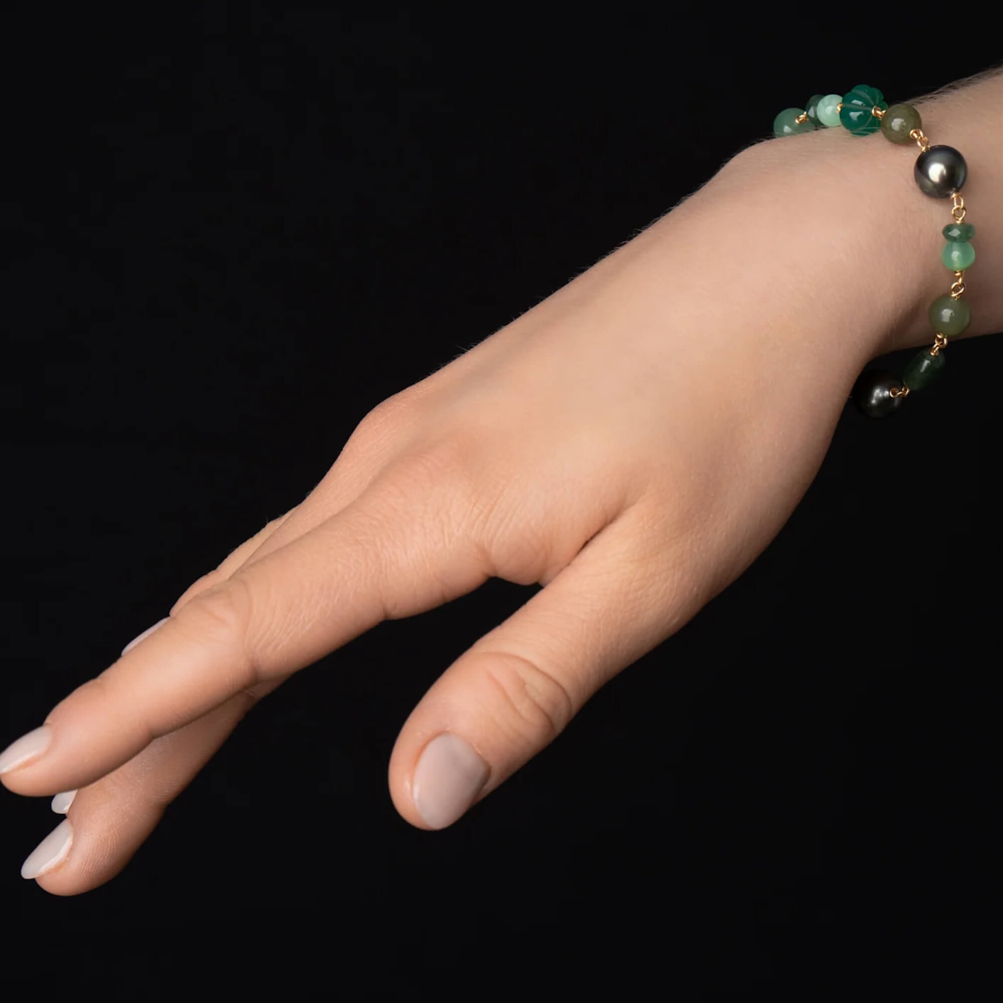 Jungle Piccolo armbåndet samler de naturlige ædelsten — nephrit, grøn onyx, grøn jordbærkvarts, aventurin, chrysopras, mosagat og tahiti barokperler — sammen ind i et livligt spektrum af utæmmede grønne nuancer.