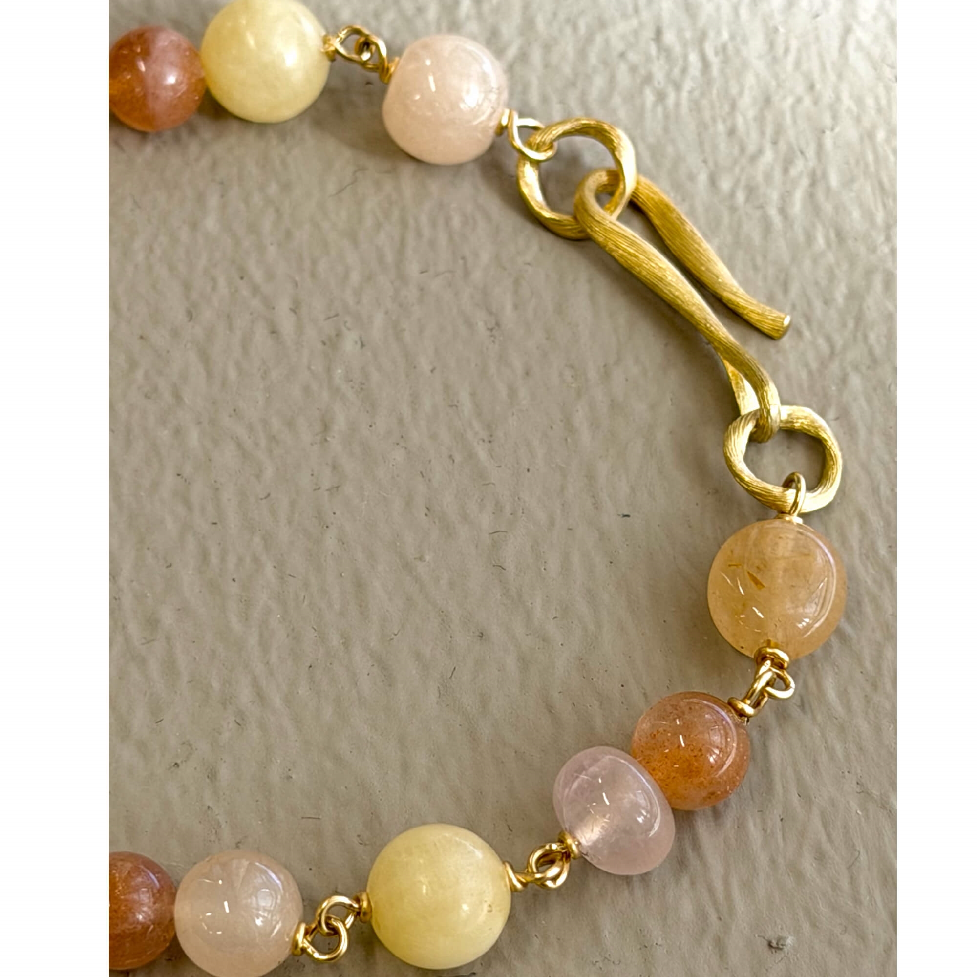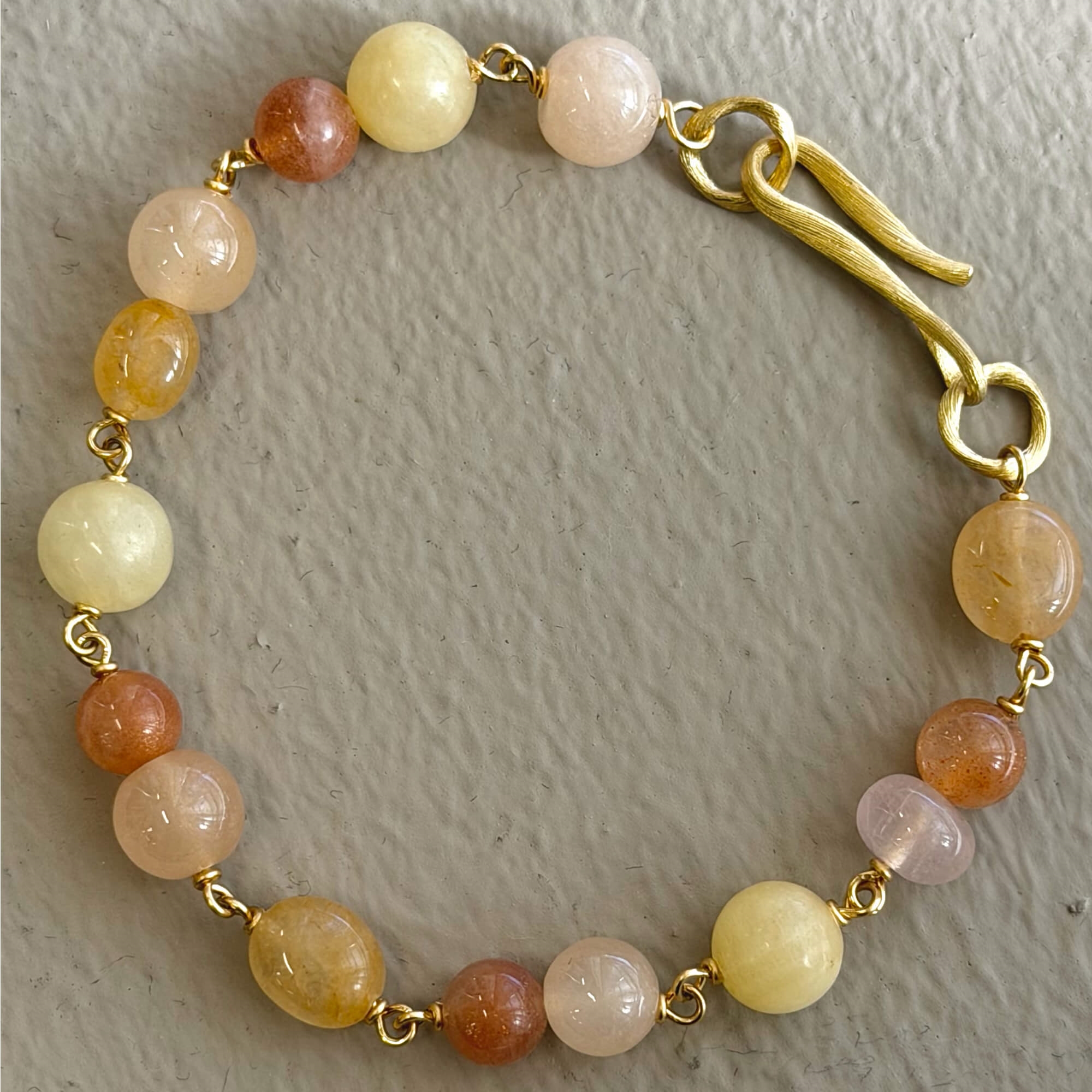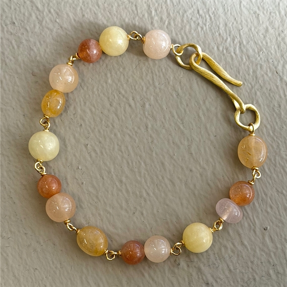 Dulong Unika Piccolo armbåndet med jubilæumssten er et eksklusivt og håndlavet smykke i 18K guld, der kombinerer elegance med et unikt, personligt udtryk. Armbåndet er sammensat af smukke, runde sten i varme nuancer af gylden, fersken og rosa, som skaber et harmonisk og levende farvespil. Hver sten er nøje udvalgt, hvilket gør hvert armbånd helt unikt. Det organiske design og den fine guldlås giver et sofistikeret og tidløst look, der kan bæres alene eller styles sammen med andre smykker for et mere personligt udtryk.