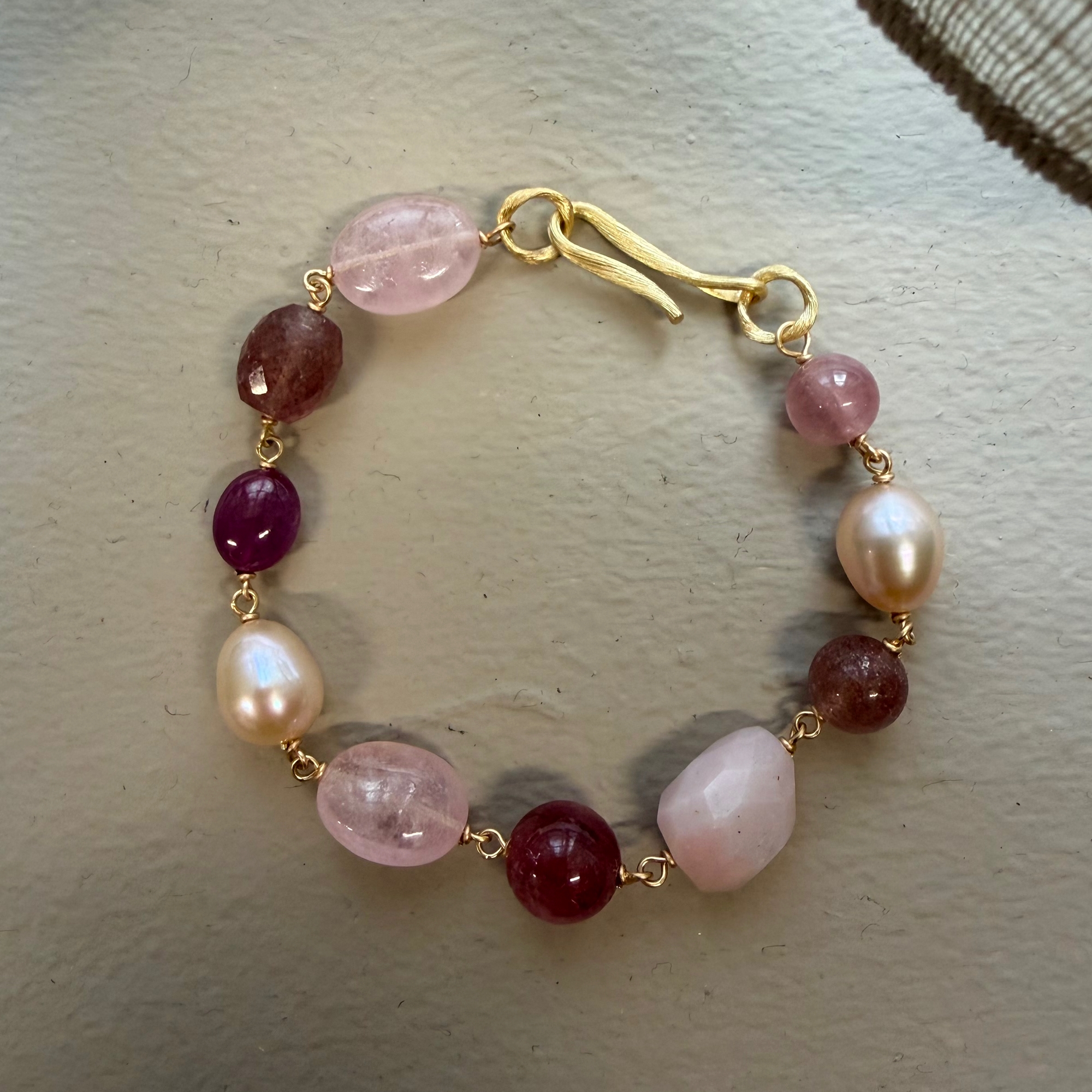 18K med Rosakvarts, ferskvandperler, jorbærkvarts, pink,opal, turmalin, mogok rubin og morganite.