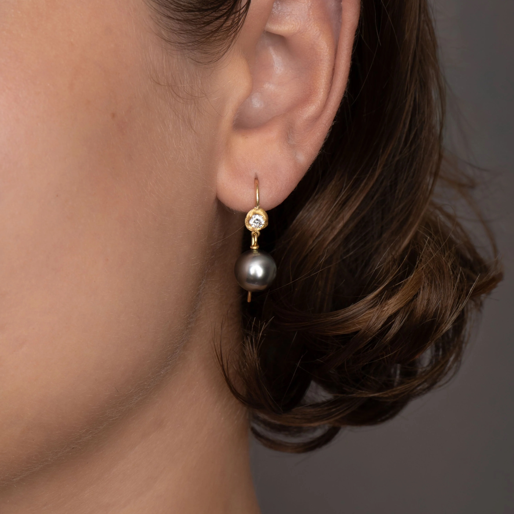 Vega Soufflé øreringene fra Dulong er skabt i 18k guld med to brillantslebne diamanter, i alt 0,46 ct., F/G, VS2, Ex. Cut, placeret ovenover lysende Tahiti-perler.